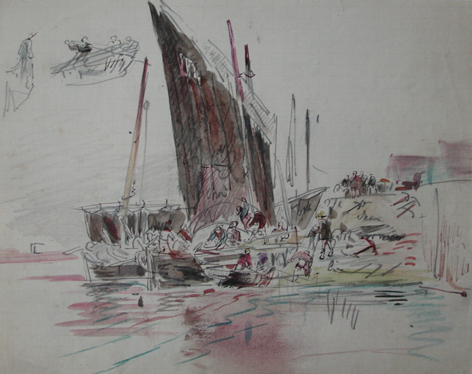 Déchargement de misainiers goémoniers à la cale du port de Tréguier (dessin aquarellé, Faudacq).Immatriculation
