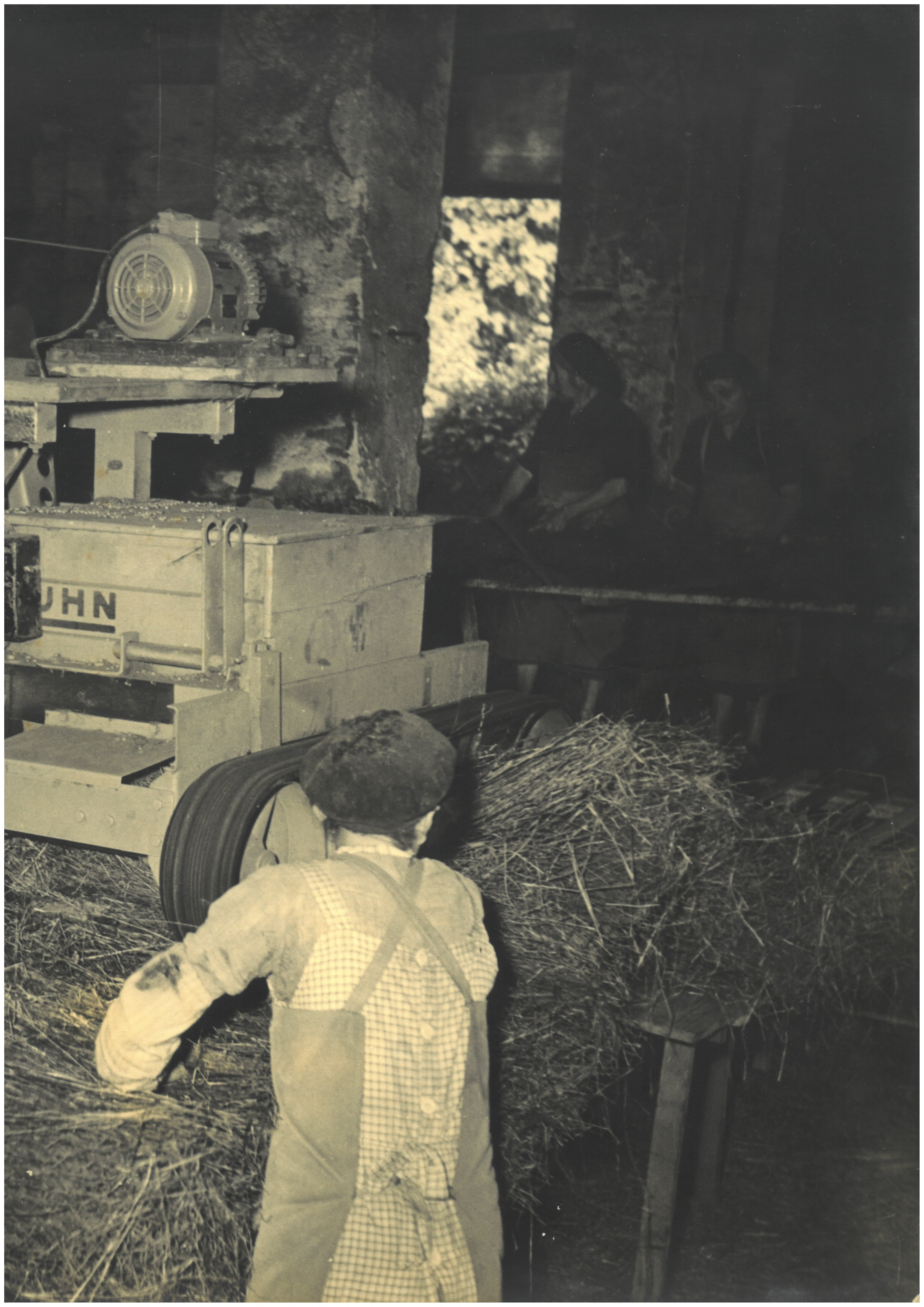 Egrenage des gerbes de lin par la batteuse (phase 1). Début des années 1950Immatriculation