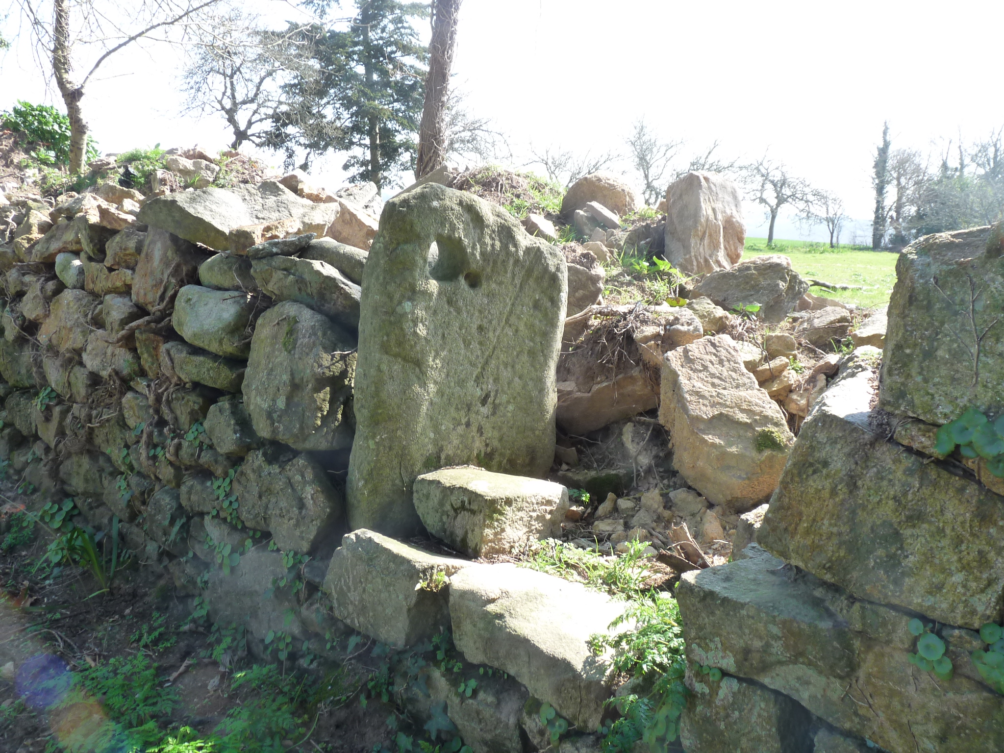 Trevern, muret de pierres sèches et entrée de champs avec korn porched (pierre de coin de champs).Immatriculation