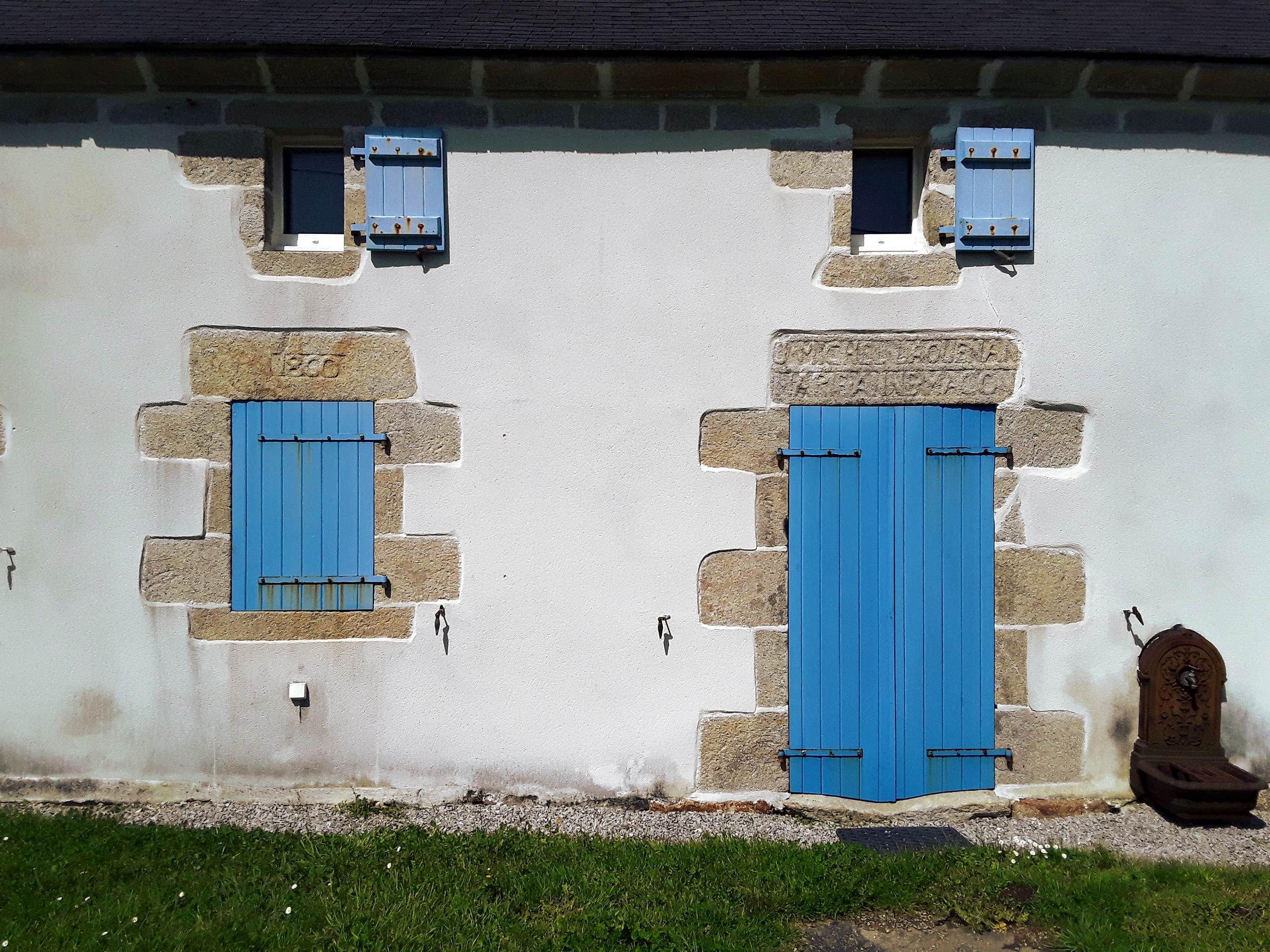 Ferme 3, logis daté 1860, détail des linteaux sculptés.Immatriculation
