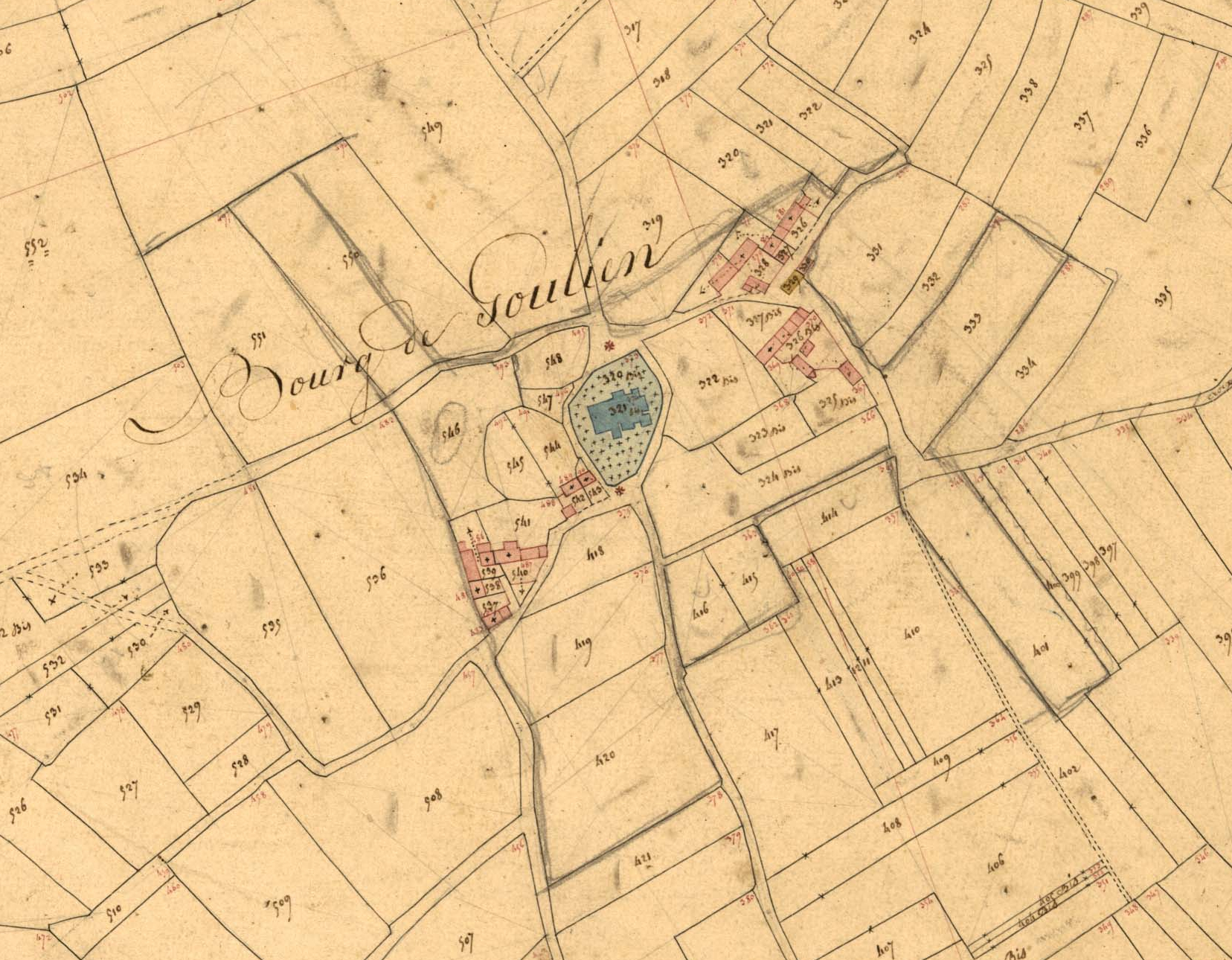 Bourg de Goulien, extrait du cadastre ancien de la commune de Goulien, 1836.Immatriculation