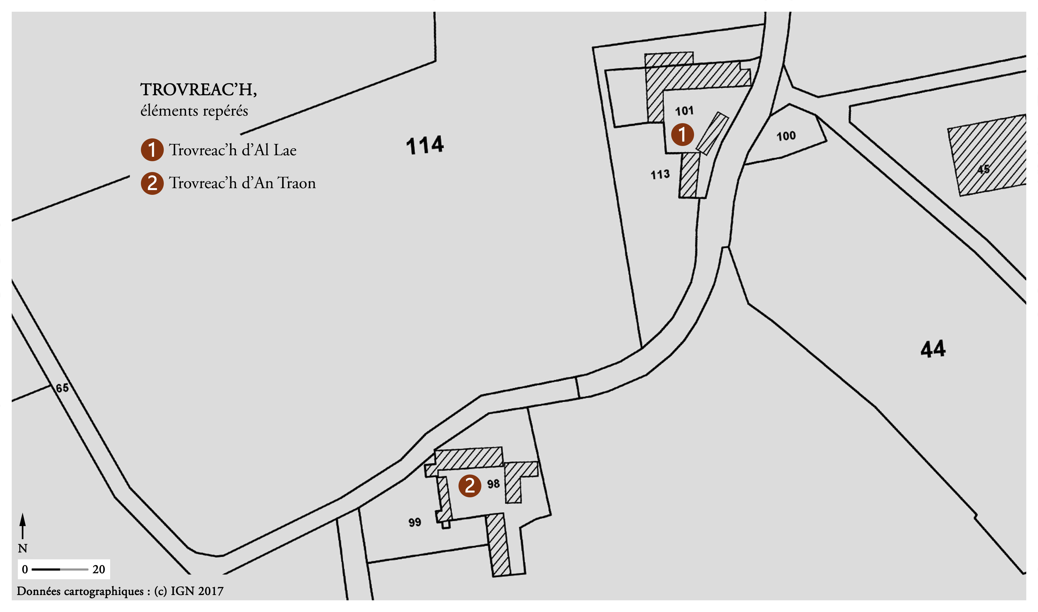Villages de Trovreac'h d'al Lae et Trovreac'h d'an Traon, éléments repérés, fond : cadastre 2017.Immatriculation