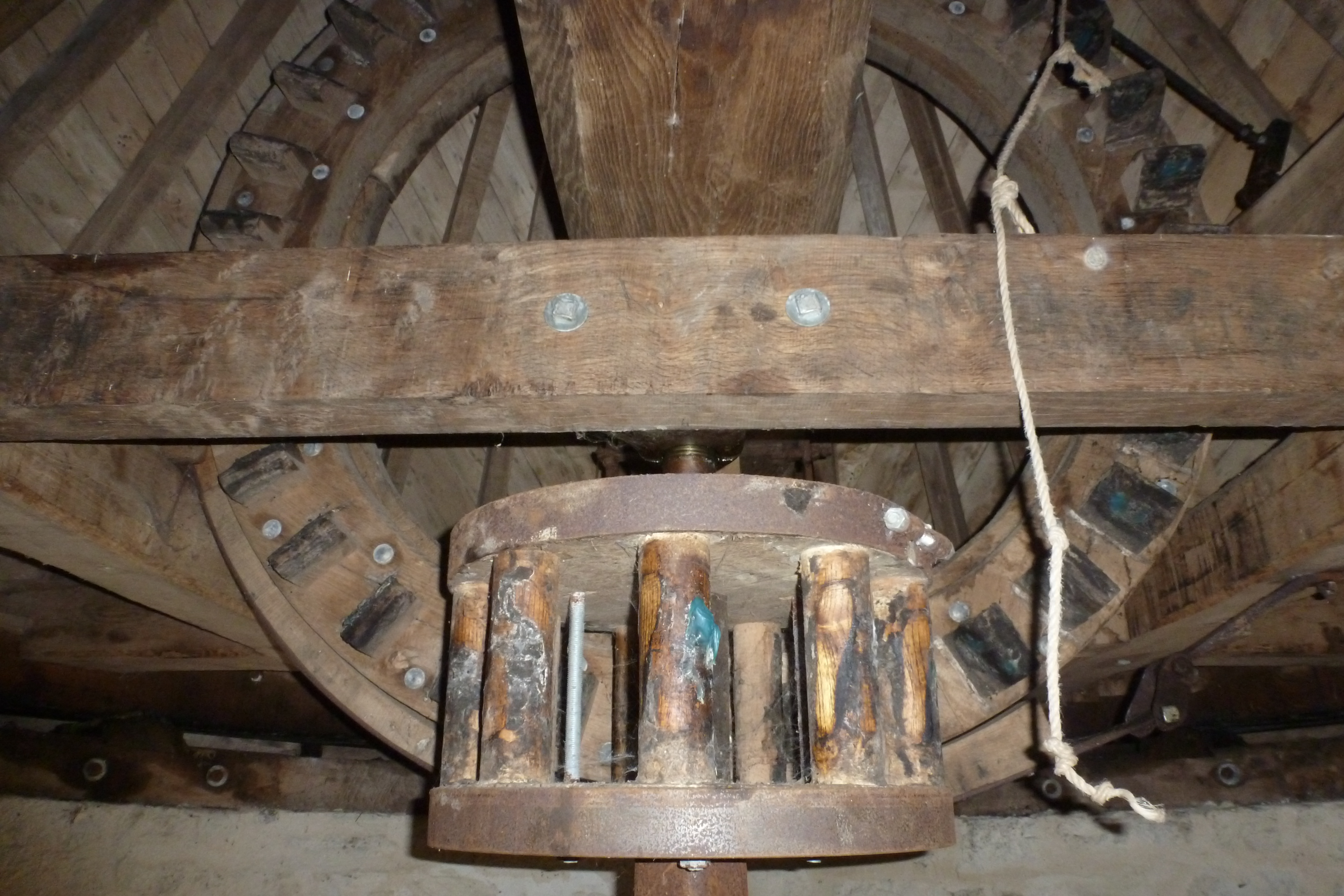 Moulin-tour de Trouguer, détail du mécanisme : rouet et lanterne.Immatriculation