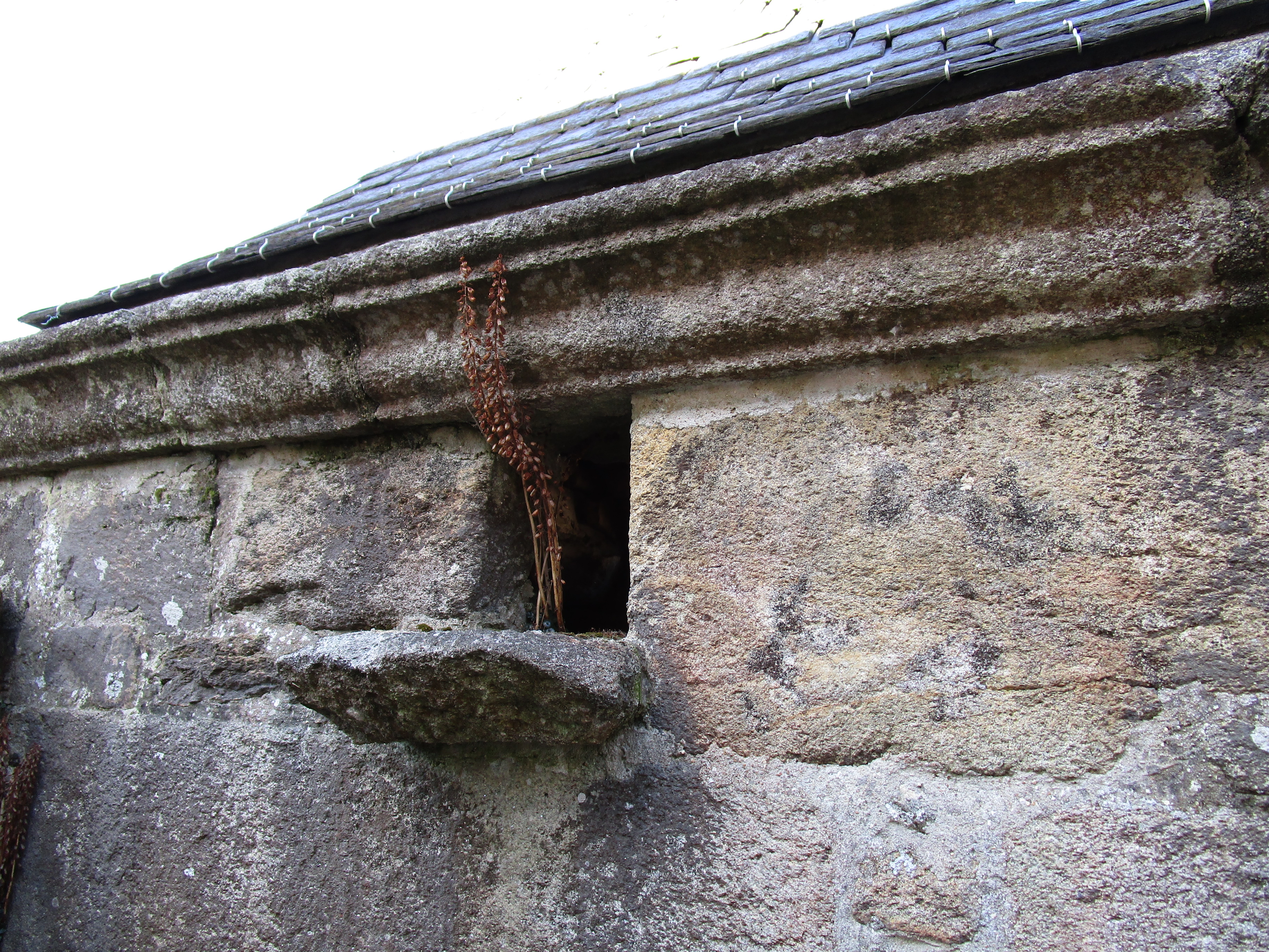 Poulailler, façade sud, jour au-dessus de la porte et corniche moulurée. (2018)Immatriculation