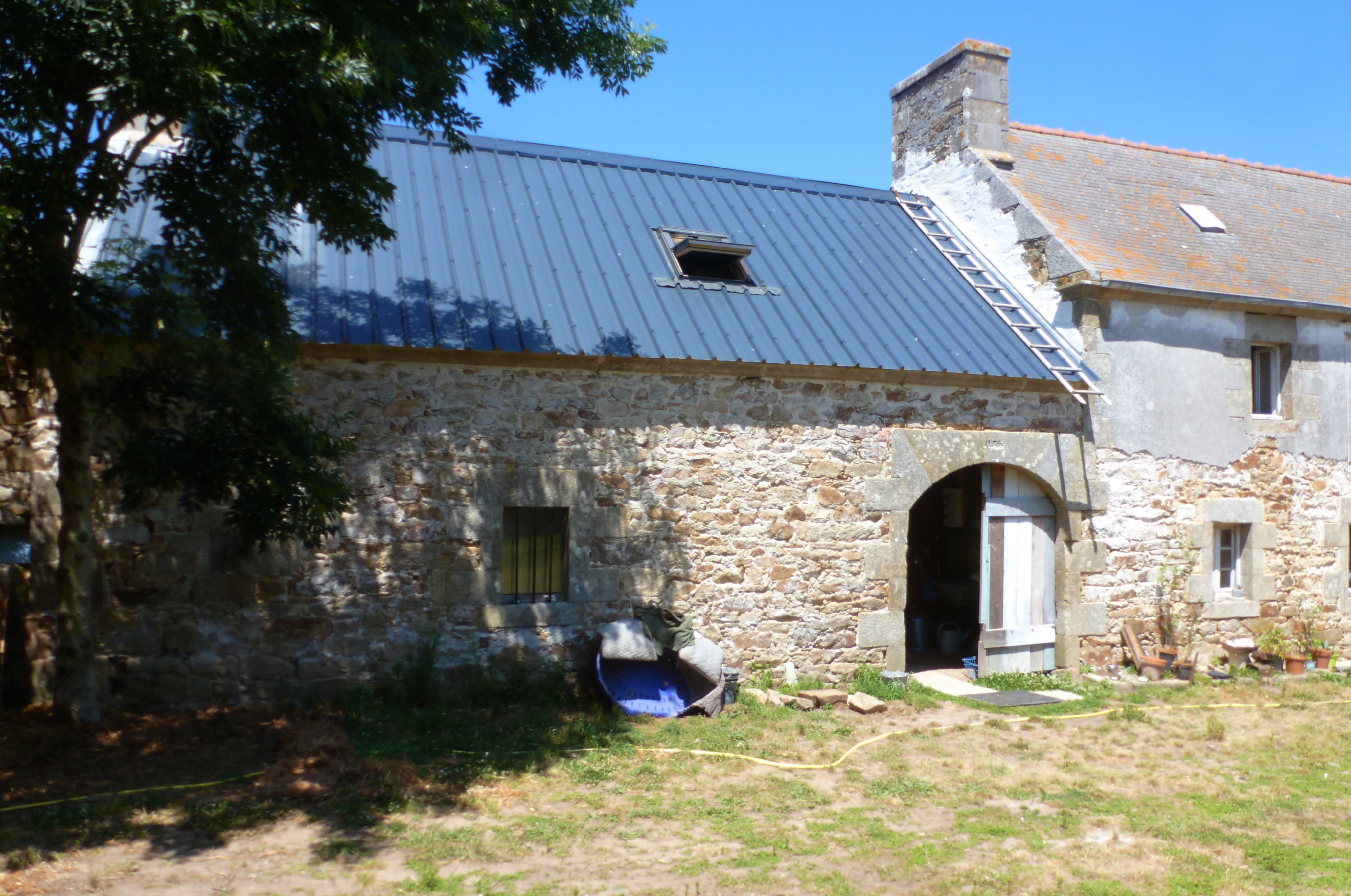 Kermeur, ferme, alignement principal : grange à porte charretière datée 1857, élévation sud. (2018)Immatriculation