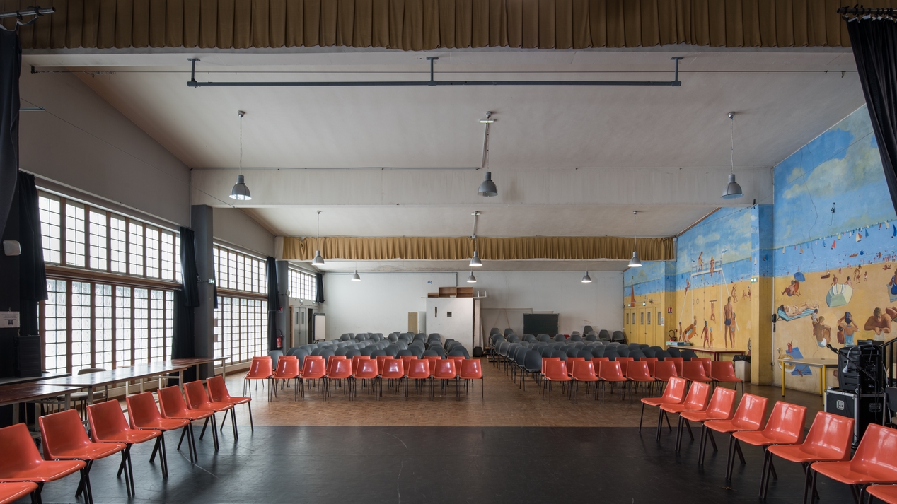 Salle des fêtes : vue d'ensemble prise depuis la scène. A gauche la verrière, à droite, la peinture murale d'Edmond Heuzé (1% artistique).Immatriculation