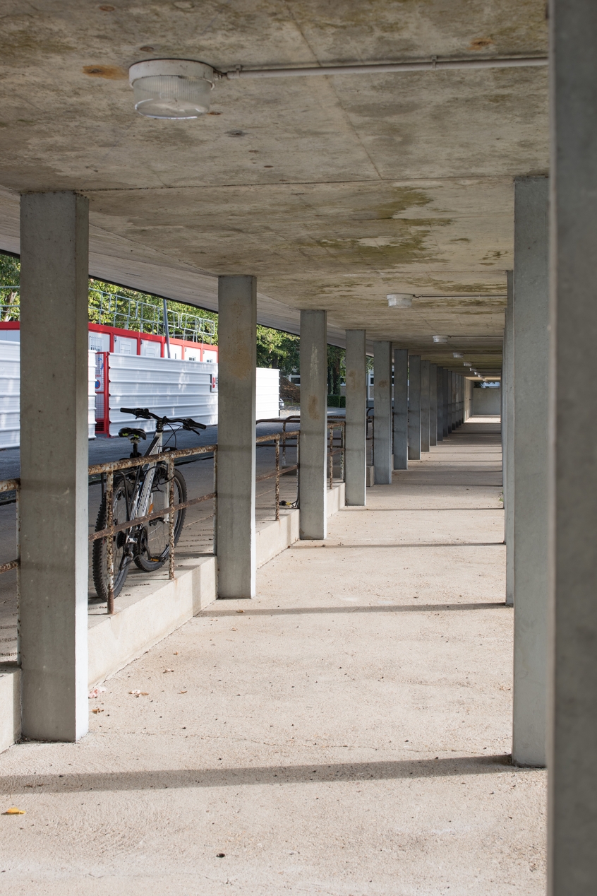 Garage à vélos et galerie de circulation accolée.Immatriculation