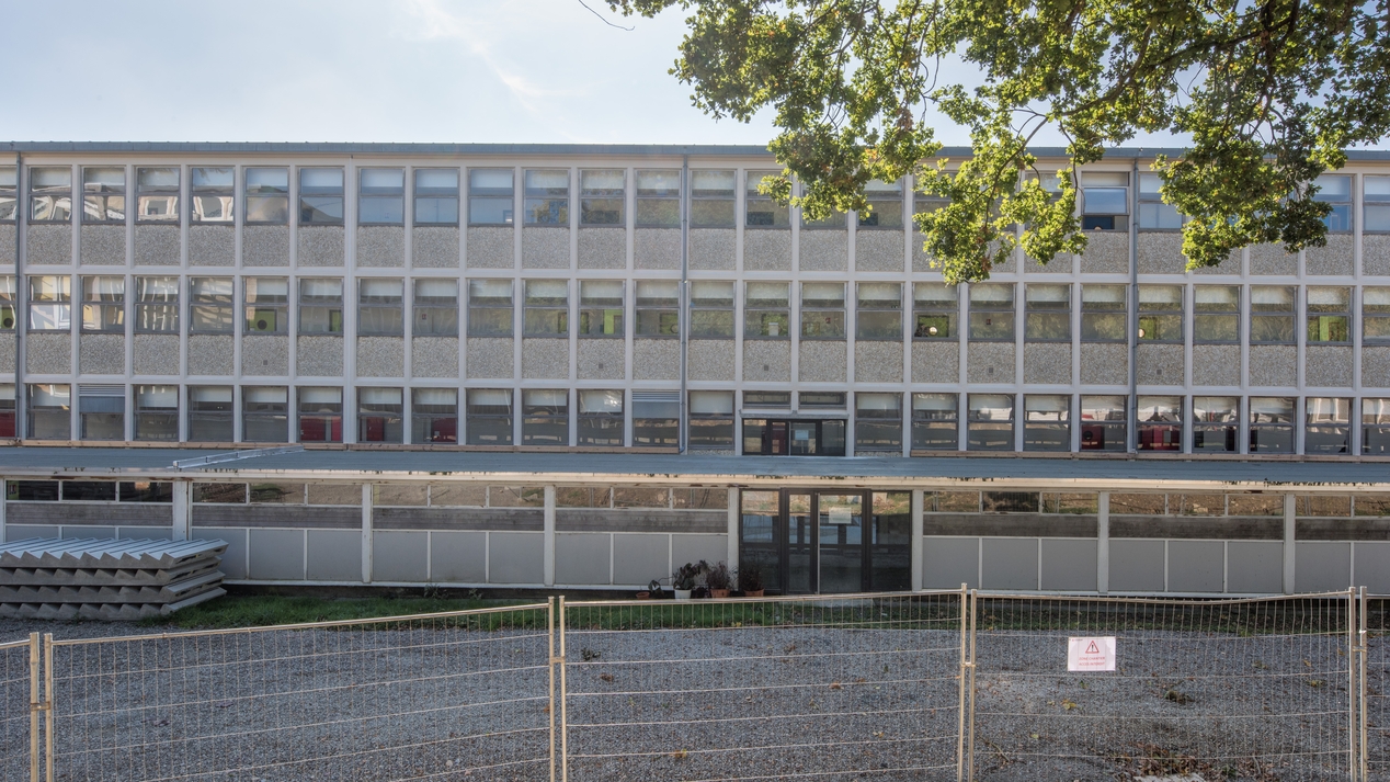 Bâtiment C (externat), détail sur la façade nord. Au premier plan, galerie de circulation hors œuvre ("le métro") ajoutée postérieurement à la construction pour absorber des flux trop denses dans les dégagements du bâtiment.Immatriculation