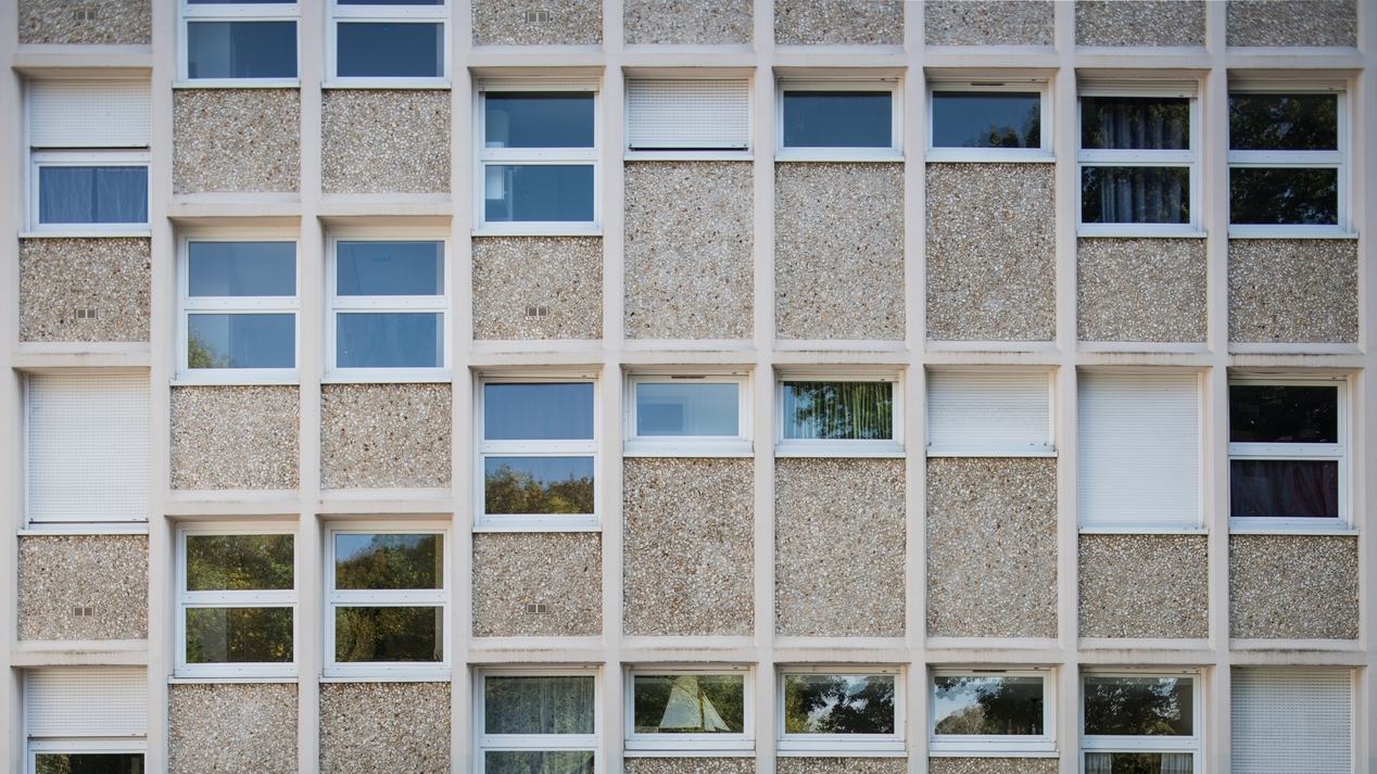 Bâtiment E (internat à l'origine), façade ouest, détail sur la trame de 1,75 m et les différentes hauteurs des allèges.Immatriculation