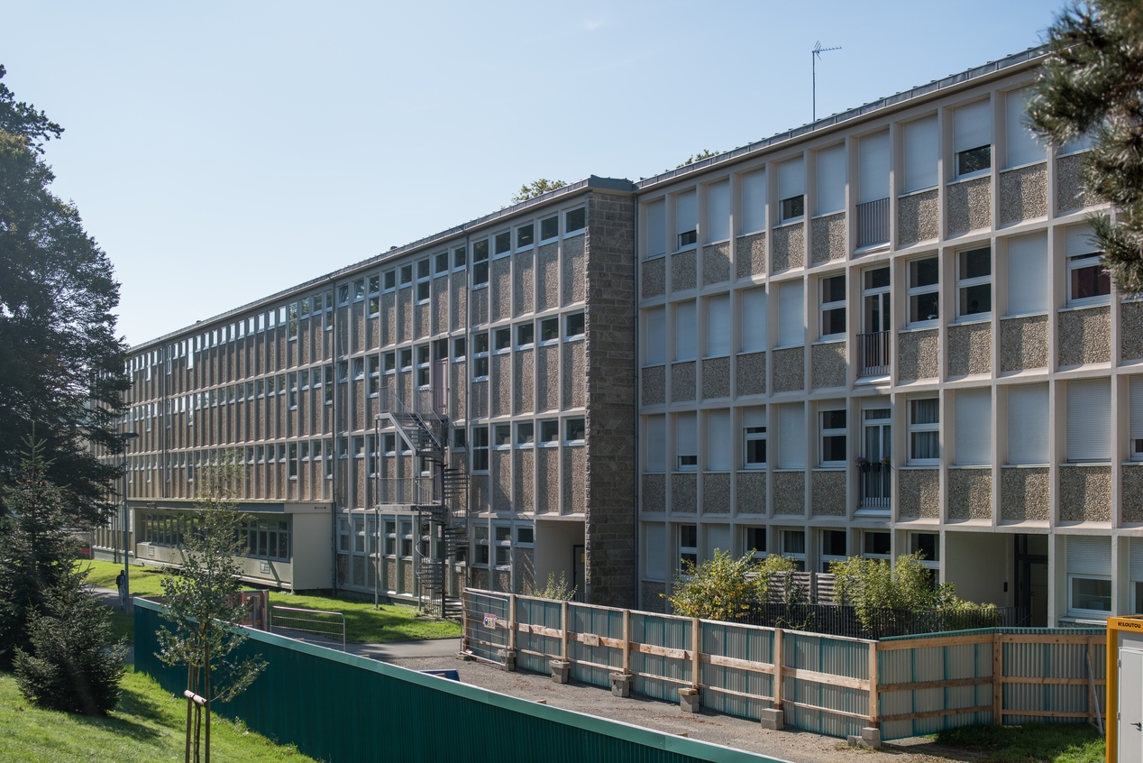 Bâtiment E, façade est. Le bâtiment d'internat, à l'origine, abrite encore des logements de fonction, à son extrémité nord (au premier plan).Immatriculation