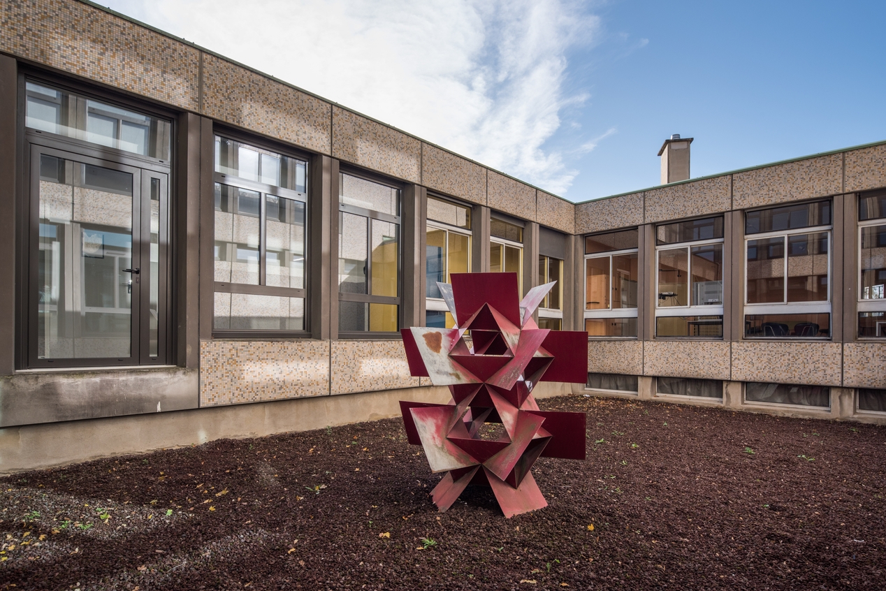 Sculpture métallique de Francisco Sobrino (1932-2014), dans le patio situé entre les bâtiments B, C et E.. C'est, semble-t-il, l'une des œuvres du 1% artistique du lycée.Immatriculation