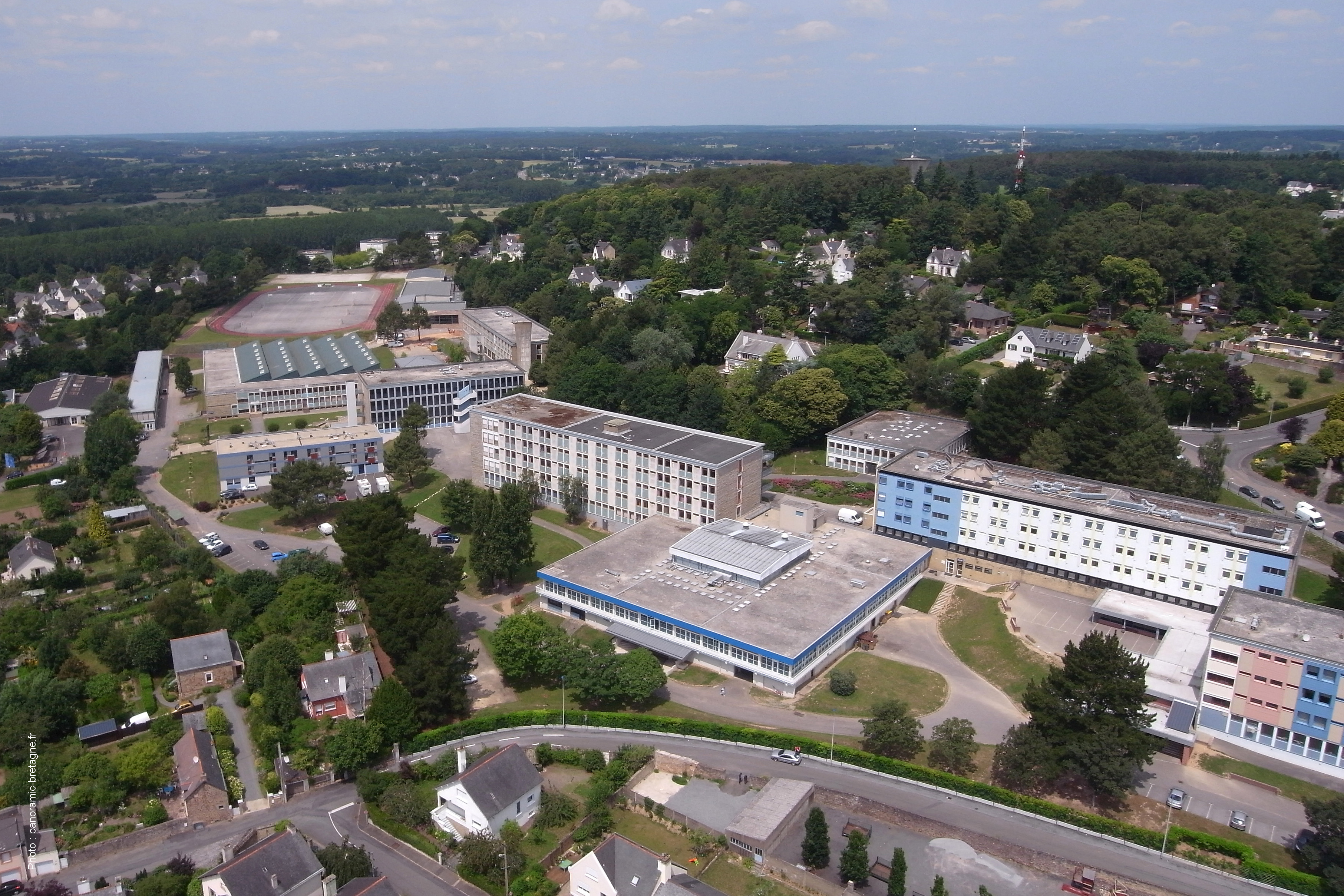 Vue aérienne du lycée. Au centre, le restaurant scolaire et l'externat F. A droite, le collège et l'internat (G). A l'arrière plan, les autres bâtiments du lycée et le plateau sportif.Immatriculation