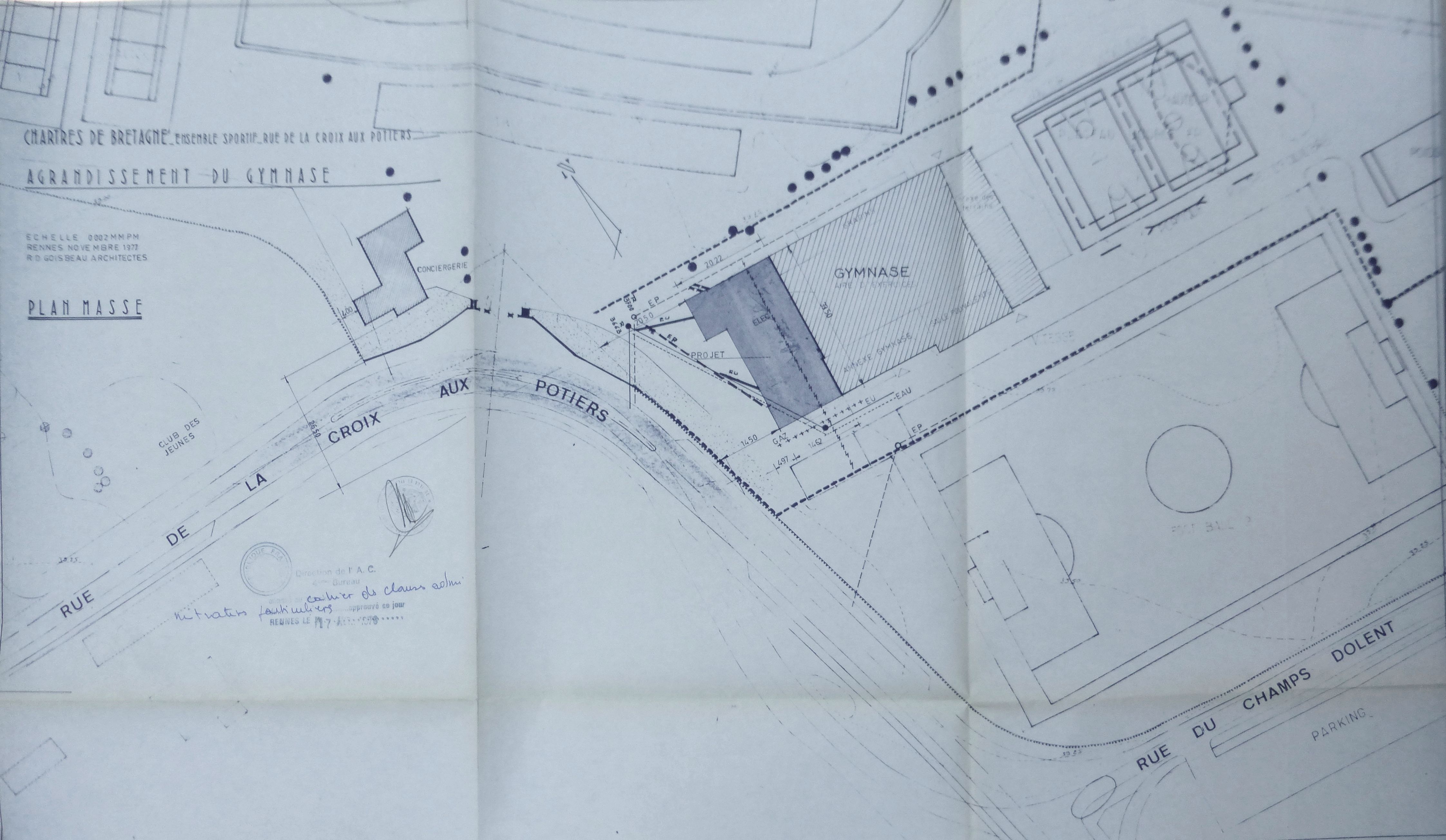 AD Ille-et-Vilaine : 1122 W 27. Agrandissement du gymnase : plan masse. R. Goisbeau, 1976.