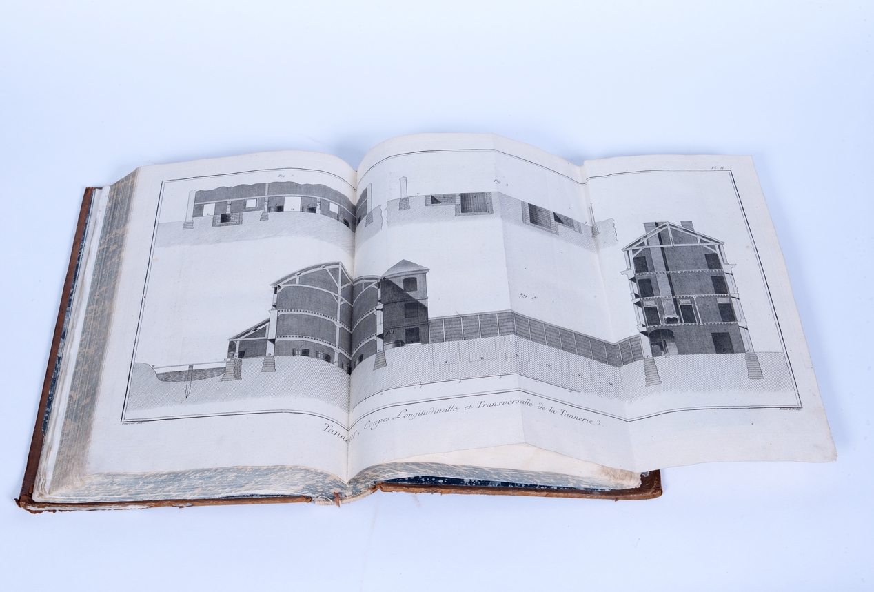 L'encyclopédie de Diderot et d'Alembert, exemplaire original. Tome 1, 1771. Coupe d'une tannerie.Immatriculation