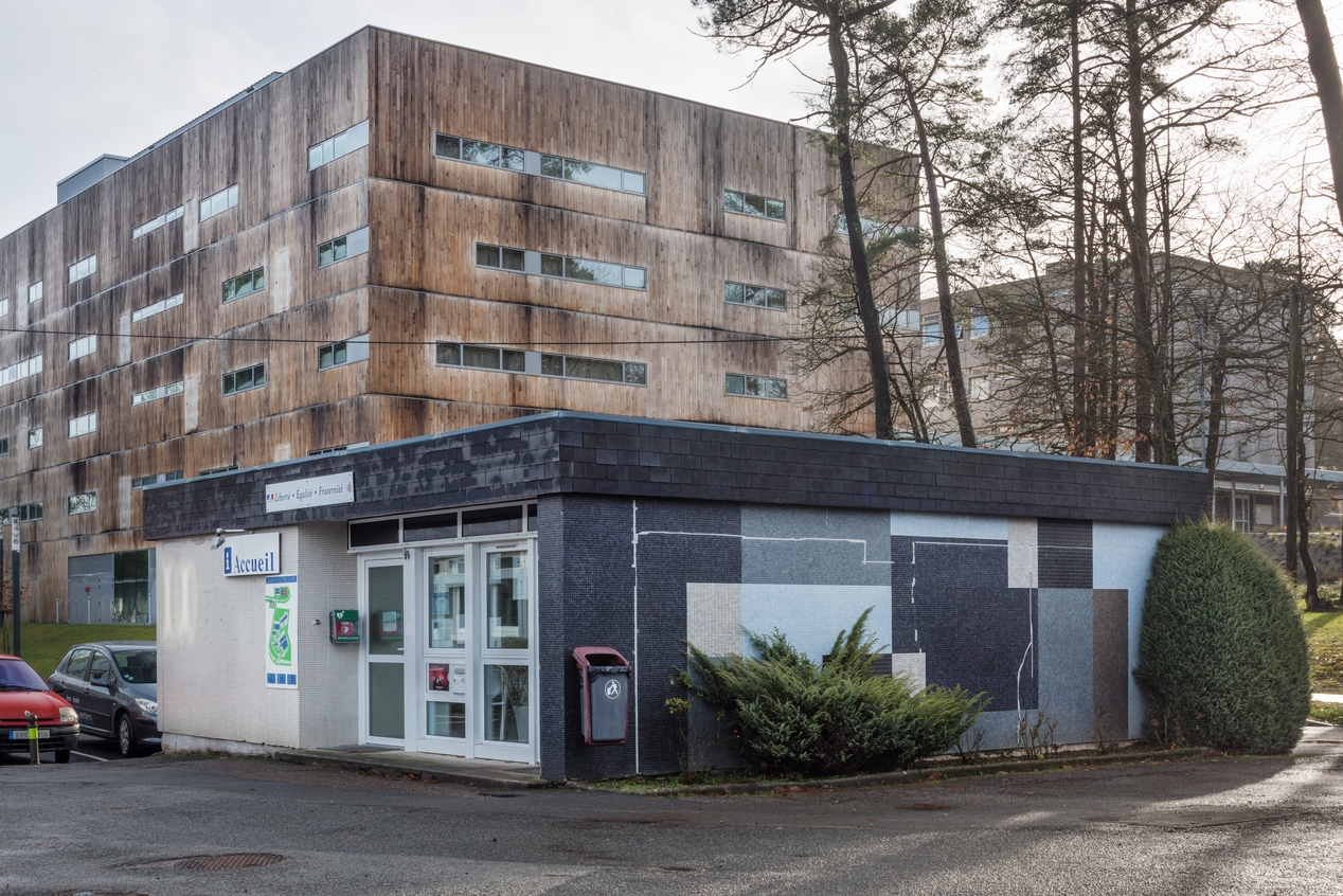 Loge d'accueil (I). A l'arrière plan, le nouvel internat (2018). Vue prise du nord.Immatriculation