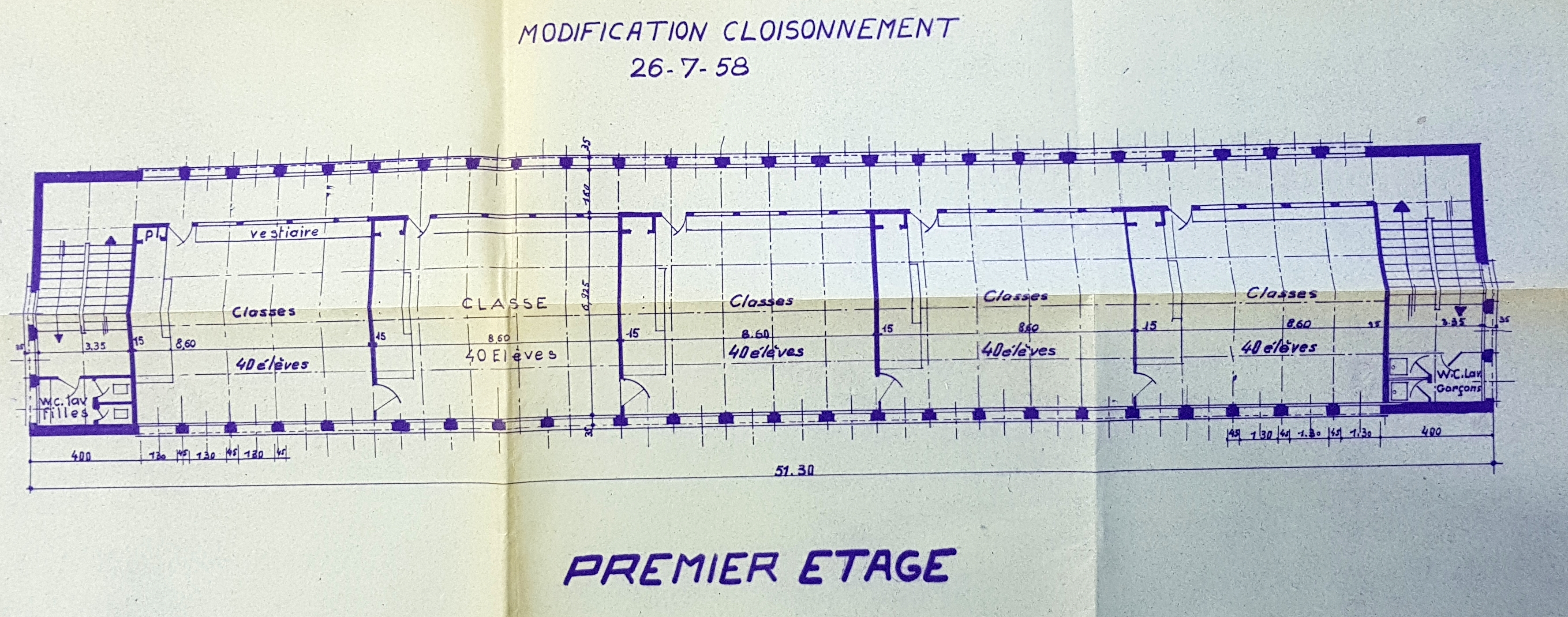 Modification cloisonnent du 1er étage, sans nom, 26/07/1958 (AM Lorient, 1NC1385). Il s'agit sans doute d'un module de 50 m du bâtiment B, ou du bâtiment C. Deux escaliers le desservent. On note la trame de 1,75 m. 5 trames équivalent à une classe de 40 élèves. L'emplacement de l'estrade y est figuré.Immatriculation