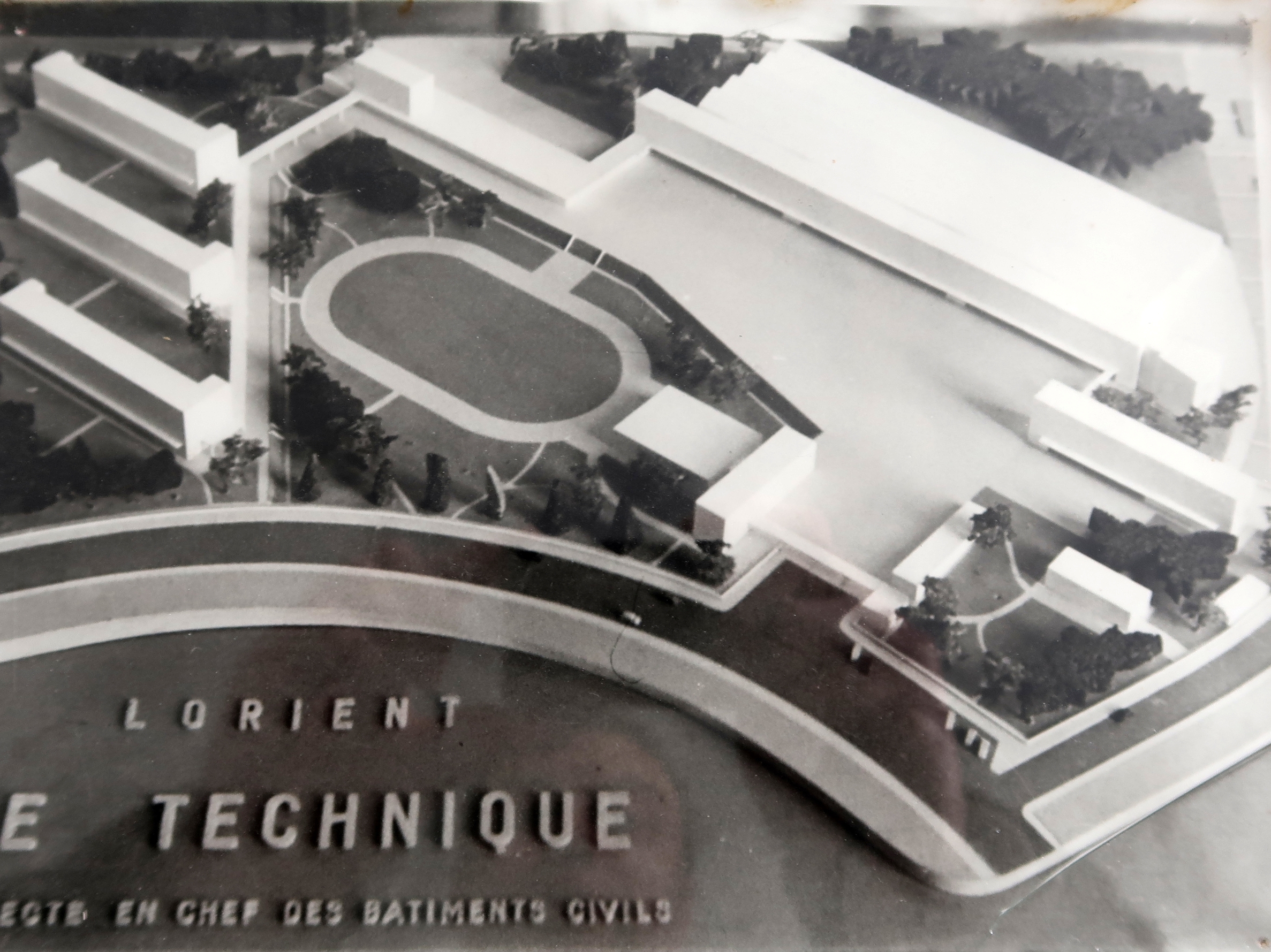 Maquette du collège national technique, futur lycée Colbert. La composition de l'entrée ici présentée avec, à sa droite, un plateau sur piloti, n'a pas été réalisée.Immatriculation
