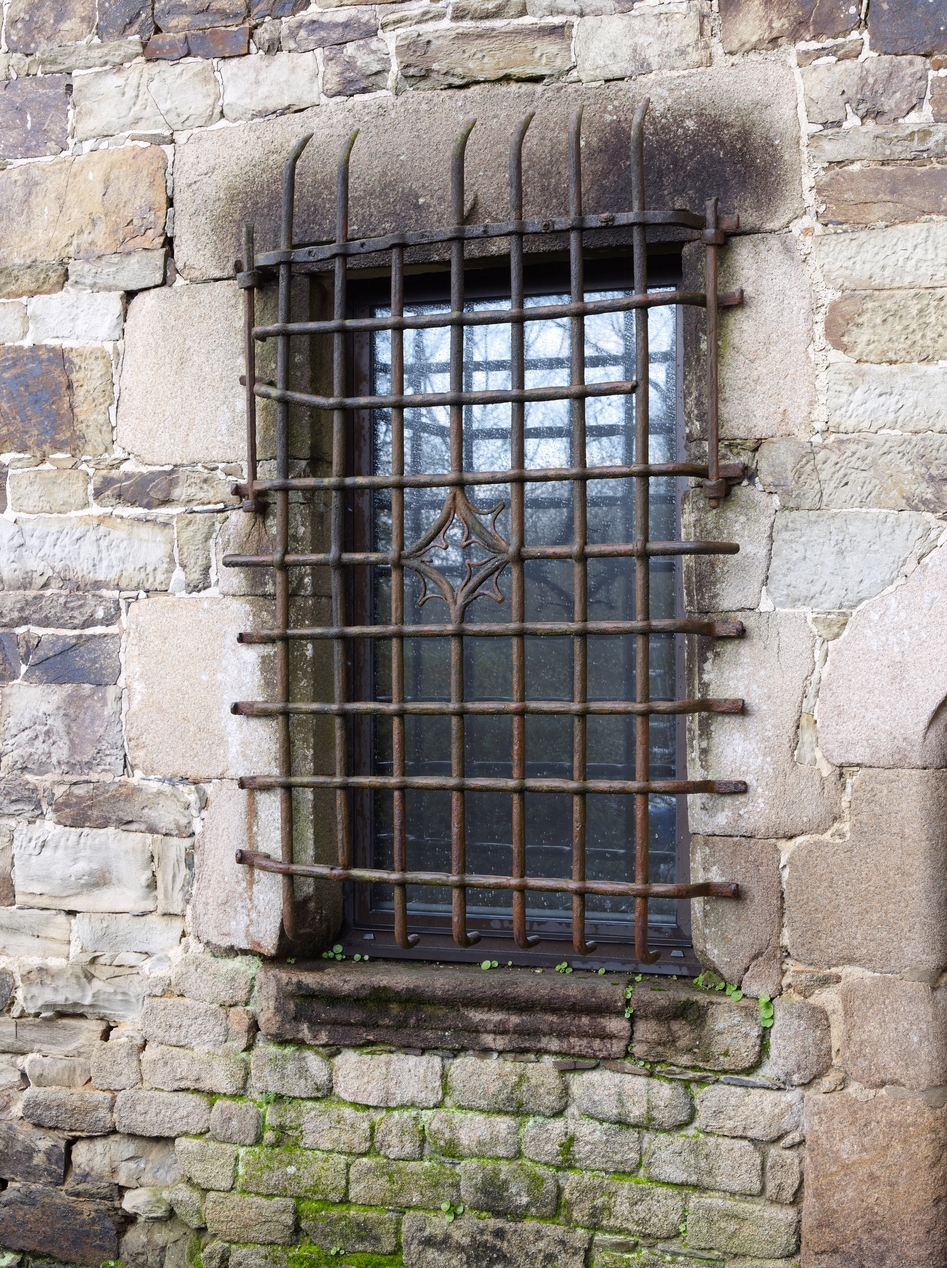 Minihy-Tréguier : manoir de Saint-Renaud, élévation est, rez-de-chaussée, détail de la fenêtre avec sa grille défensiveImmatriculation
