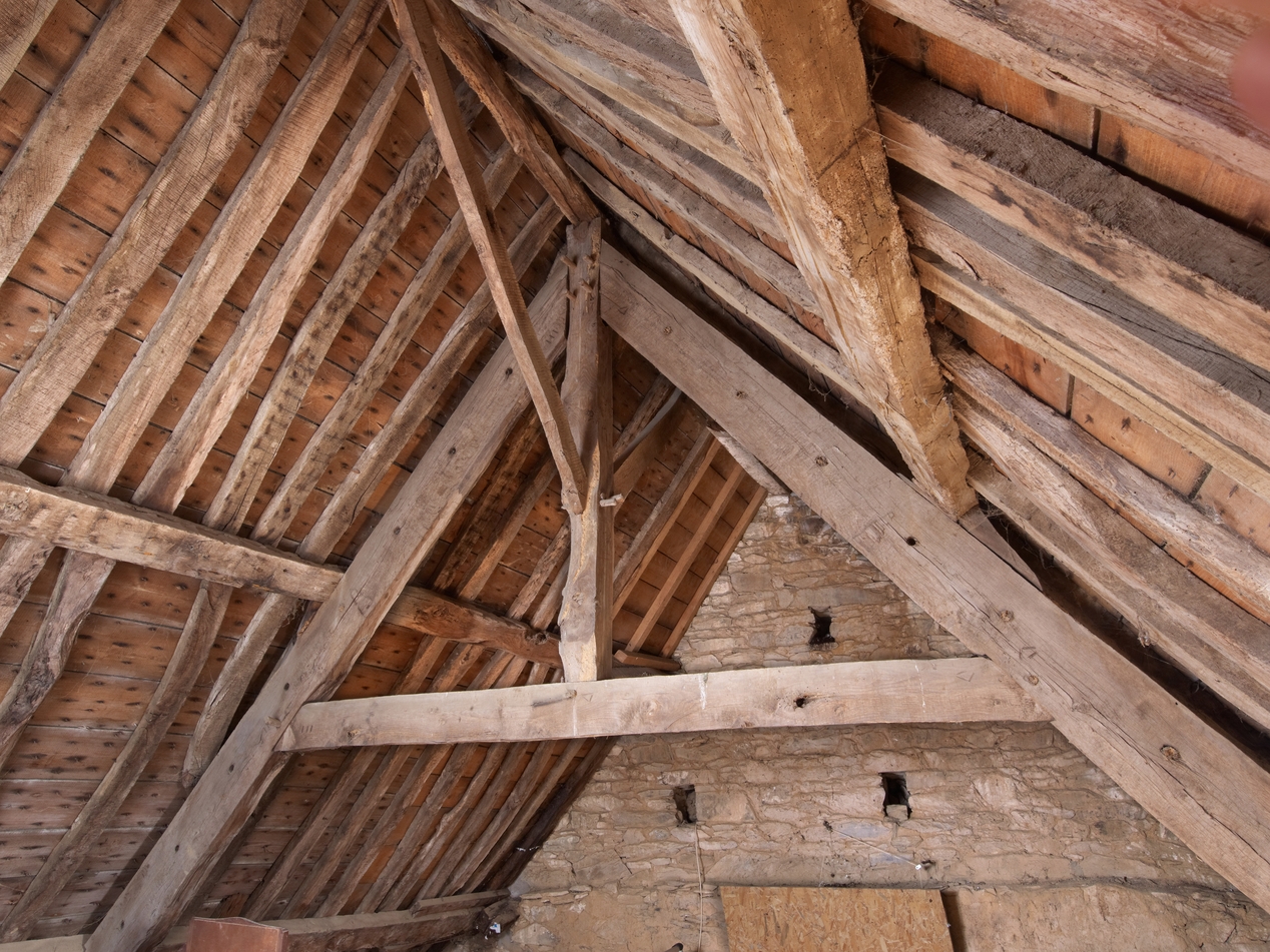 Minihy-Tréguier : manoir de Traou Martin, partie ouest, détail de la charpenteImmatriculation
