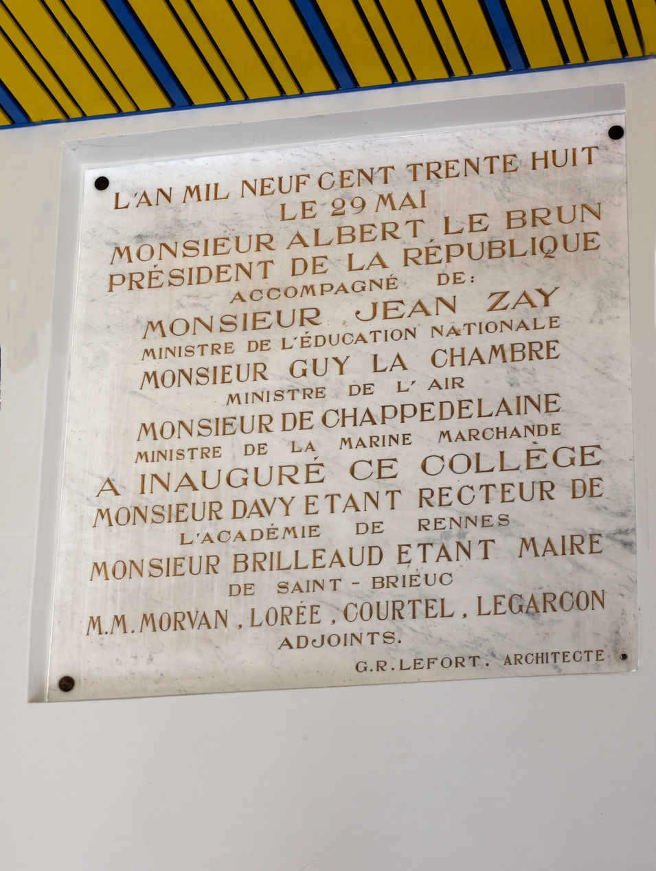 Plaque commémorative de l'inauguration du "collège" par Albert Lebrun, Président de la République et, entre autres, Jean Zay, ministre de l’Éducation Nationale, le 29 mai 1938.Immatriculation