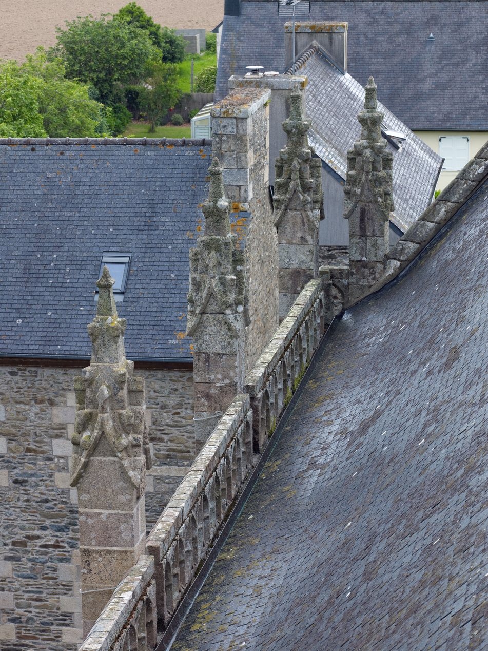 Minihy-Tréguier, rue de l'Église : église Saint-Yves, détail du garde-corps à la base de son toit et des pinacles des contreforts (fin 19e siècle)Immatriculation