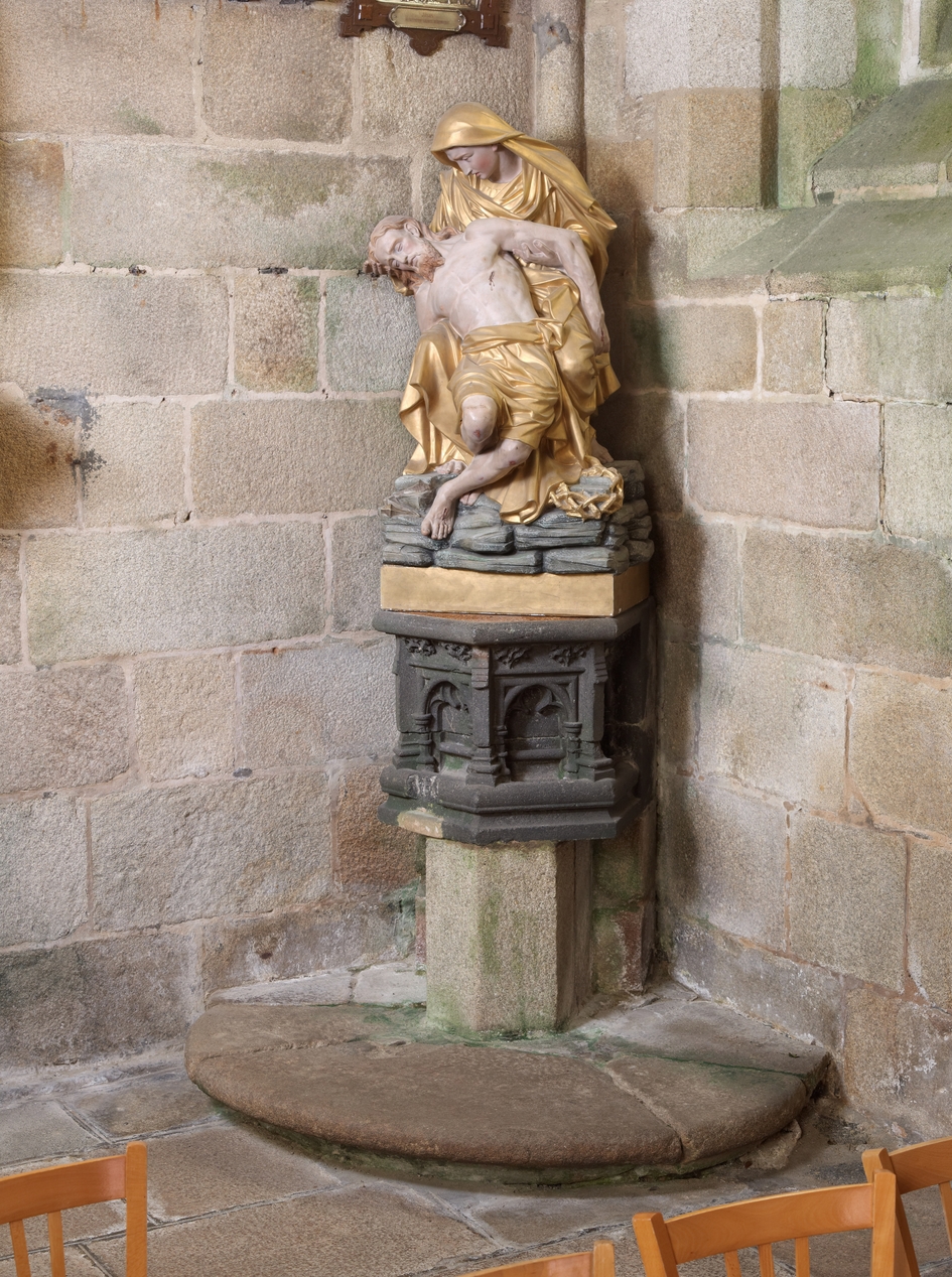 Minihy-Tréguier, rue de l'Église : église Saint-Yves, Pietà posée sur le tronc à offrandeImmatriculation