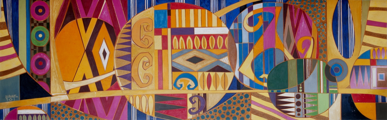 "Les Jeux de lumière", toile marouflée de Fañch Michelet, 1974. Il s'agit du "1% artistique" associé à l'agrandissement des années 1960. La toile est placée dans le foyer du bâtiment D. La photographie a été retouchée pour "nettoyer" les graffitis.Immatriculation