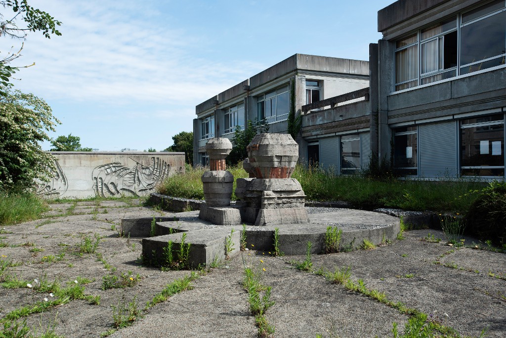 Les bonshommes : groupe sculpté en béton et brique (Bernard Alleaume et Yvette Vincent-Alleaume, 1974).Immatriculation