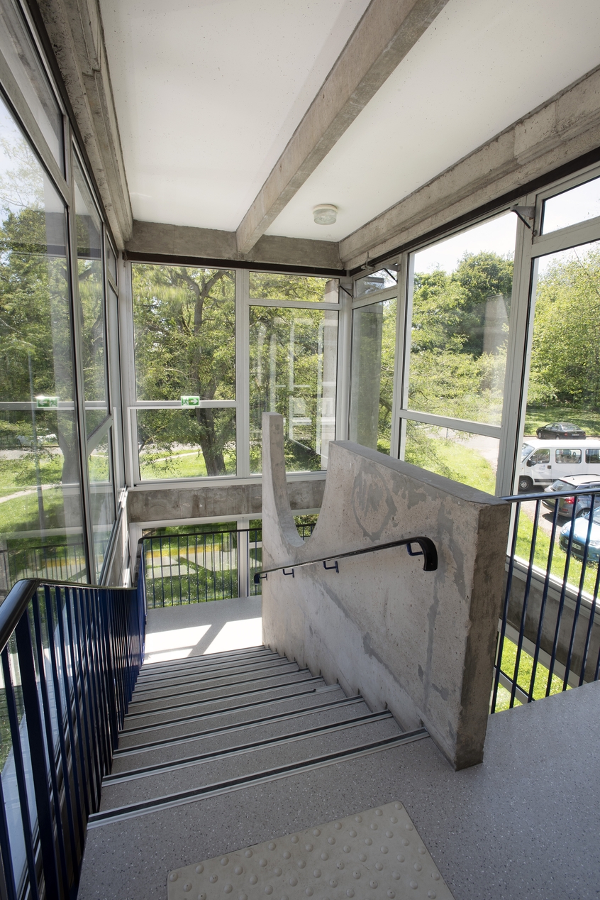 Cage d'escalier au sud de l'aile ouest de l'externat. Noter le design du noyau central en béton, et son rôle porteur, qui autorise des façades entièrement vitrées sur trois côtés.Immatriculation