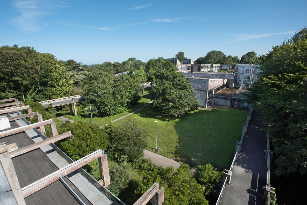 Une composition qui dialogue avec l'environnement. L'internat et l'externat sont séparés par un talweg et reliés entre eux par deux passerelles. Au premier plan, le portique de l'internat, façade sud. A l'arrière plan, vue d'ensemble de l'externat et du gymnase.Immatriculation