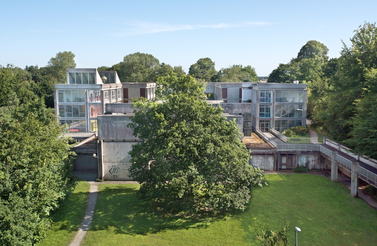 Vue d'ensemble de l'externat, prise depuis les toits de l'internat, au nord. Au premier pla, le talweg et la passerelle ouest. A l'arrière plan, l'externat proprement dit.Immatriculation