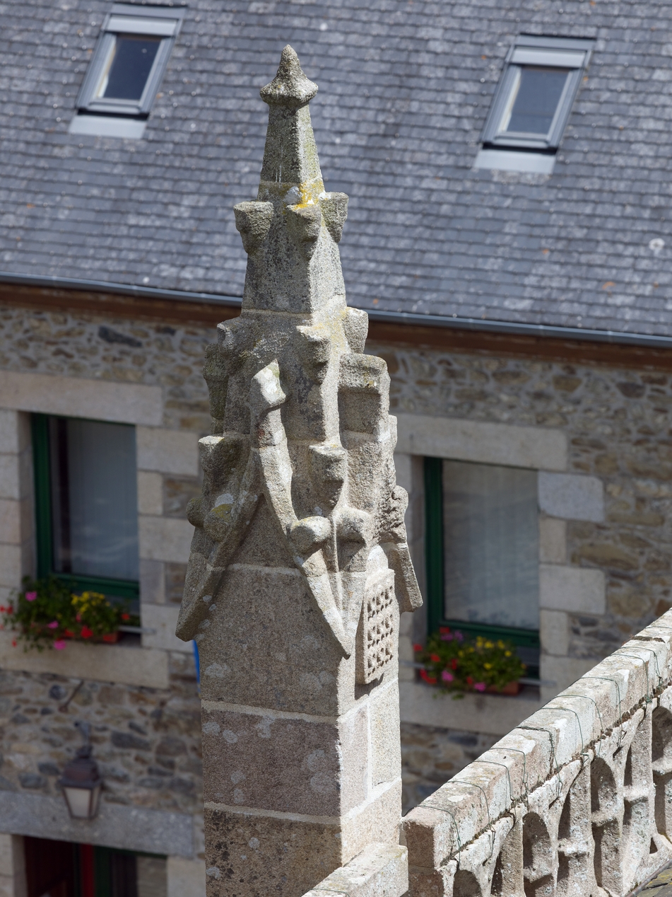 Minihy-Tréguier, rue de l'Église : église Saint-Yves, détail de l'un des pinacles des contreforts frappé d'armoiriesImmatriculation
