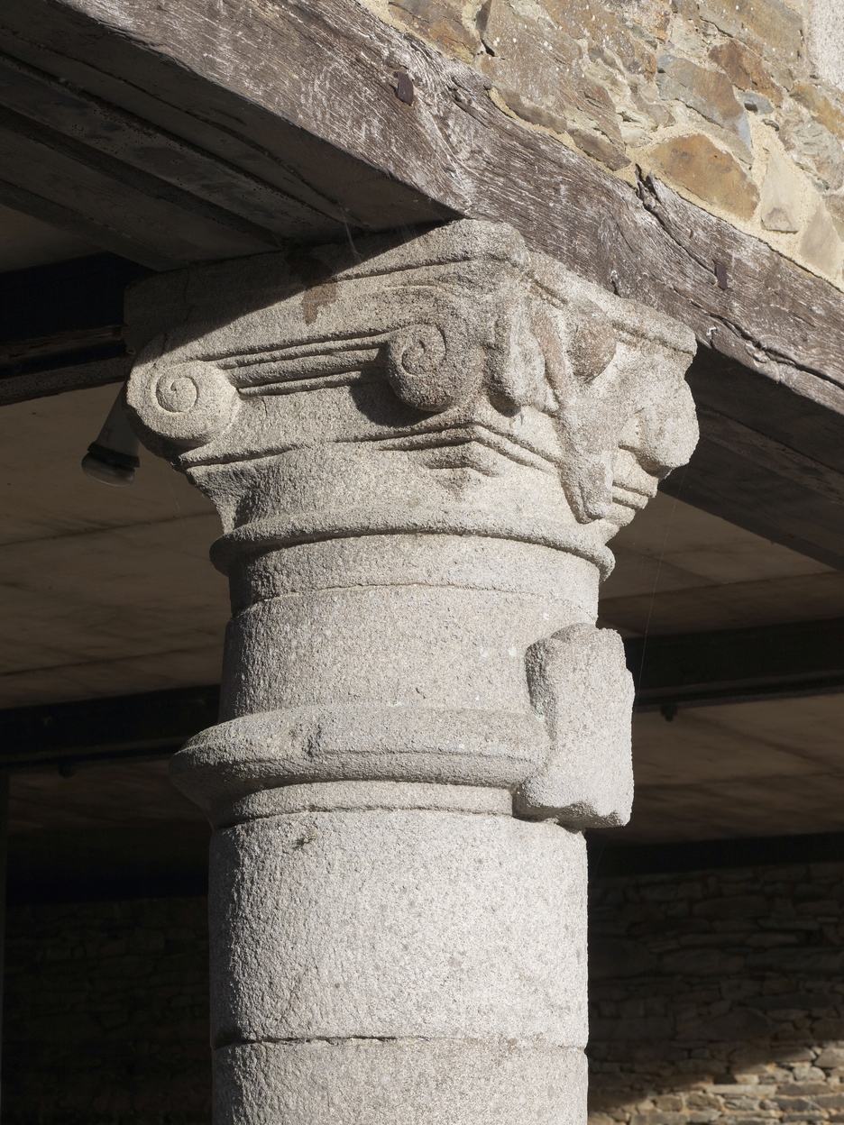 Aile nord en retour d'équerre, élévation est, galerie servant de remise, détail de l'une des colonnes aux chapiteaux sculptés (les armoiries restent muettes)Immatriculation