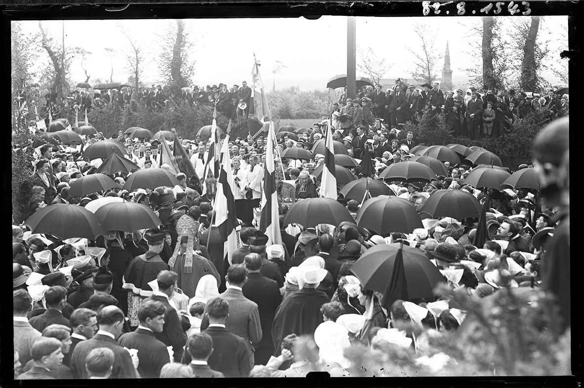 Minihy-Tréguier, le pardon de Saint-Yves par Raphaël Binet, vers 1920-1929. En arrière-plan, le clocher de l'église de Minihy-TréguierImmatriculation