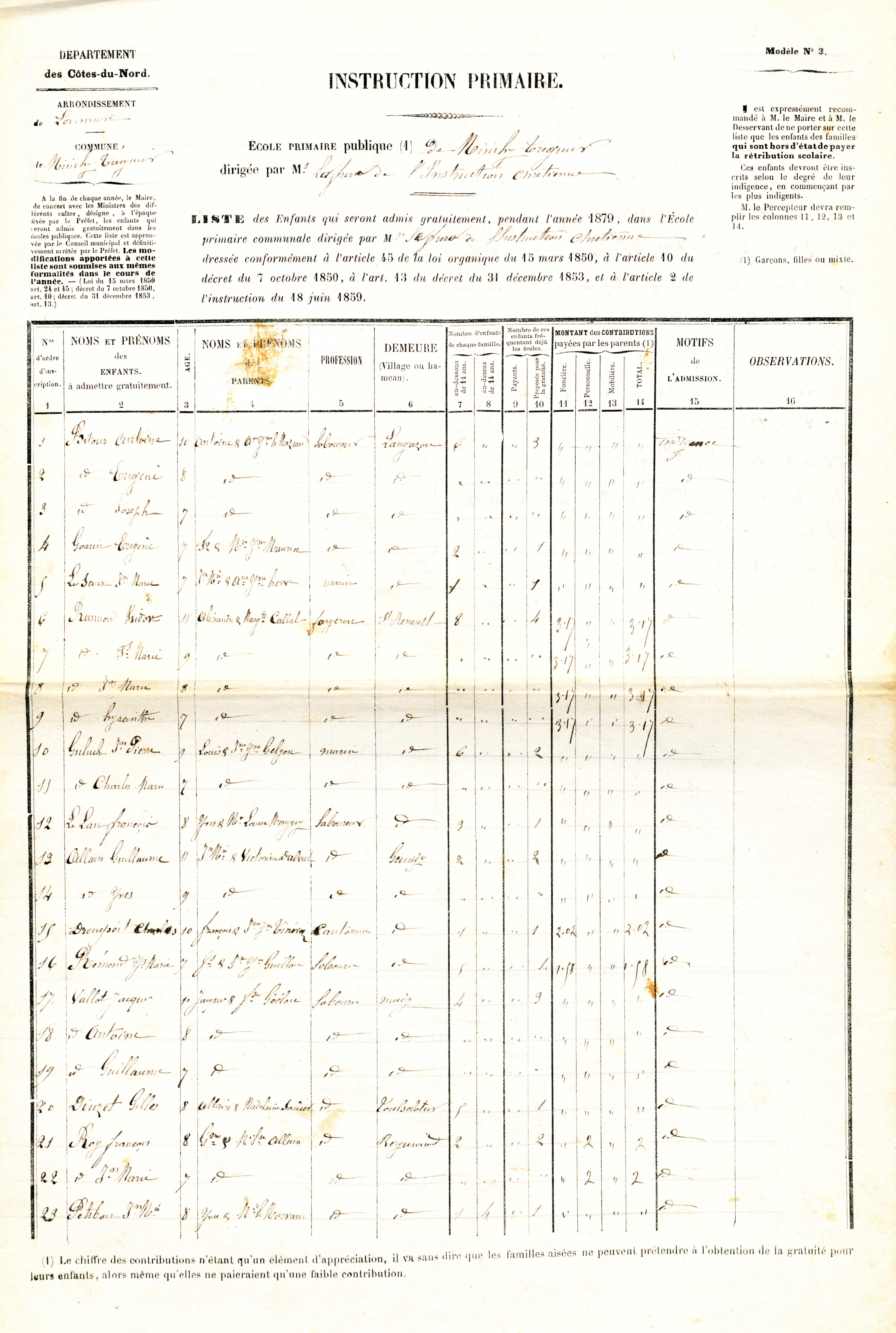 Reproduction de l'instruction primaire publique de Minihy-Tréguier. Liste des enfants qui seront admis gratuitement pendant l’année 1879 dans l’école primaire communale, 16 décembre 1878 (Archives départementales des Côtes-d’Armor : 1T174, école primaire de Minihy-Tréguier : 1833-1880)Immatriculation