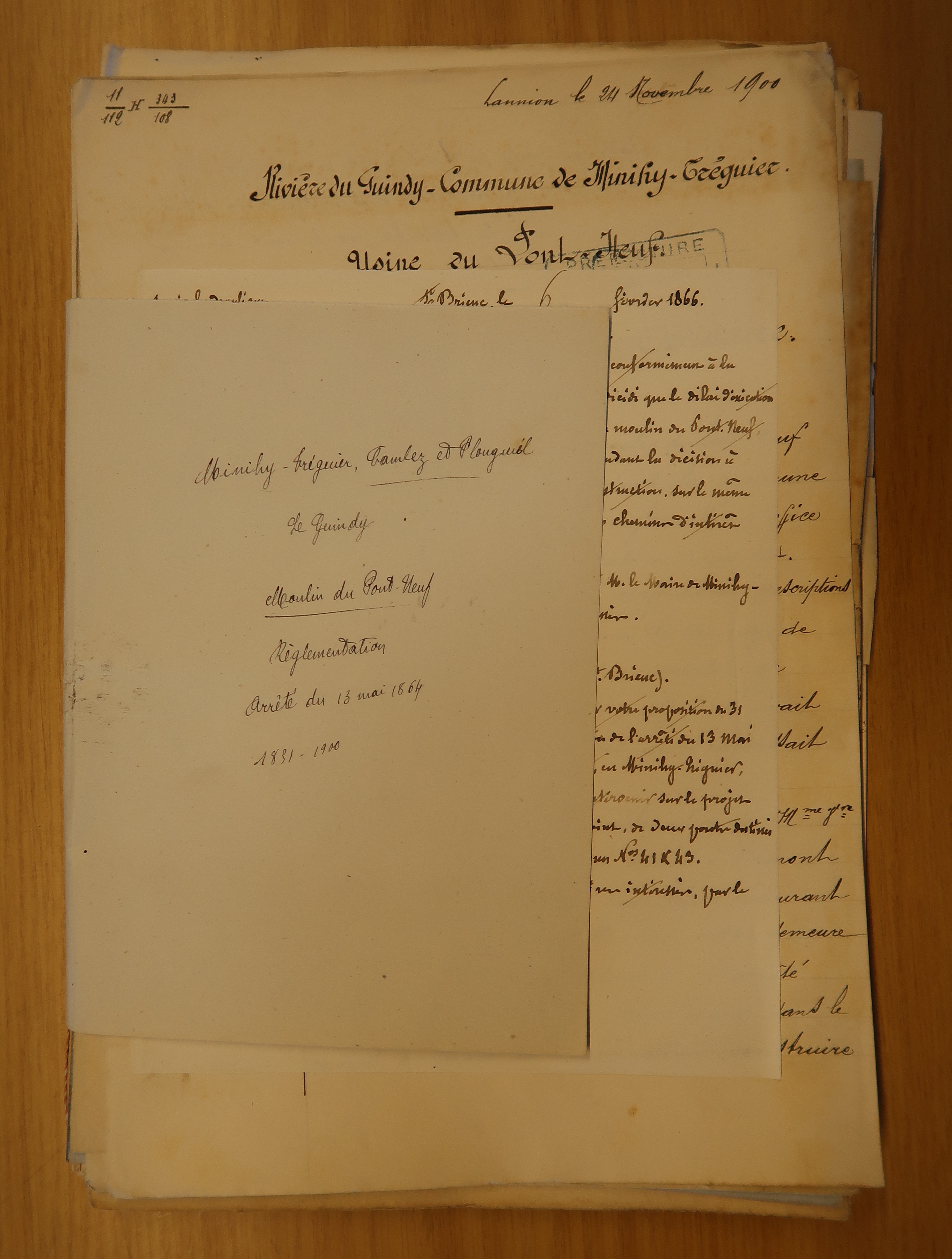 Liasse d'archives concernant le Moulin du Pont Neuf à Minihy-Tréguier (Archives départementales des Côtes-d’Armor : 8 S 6 Guindy et affluents)-
