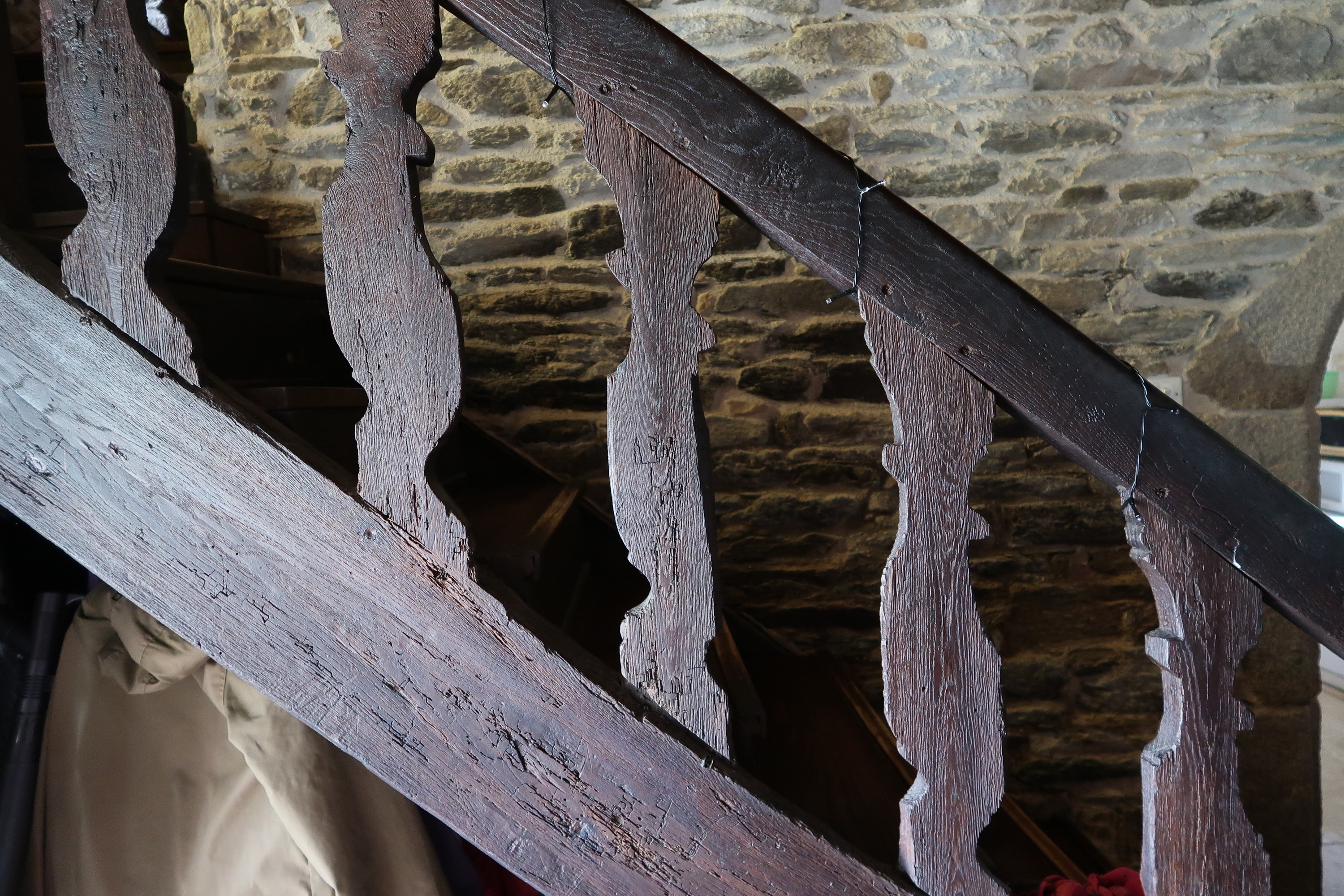 Minihy-Tréguier : manoir du Merdy, escalier, détail de la balustre de boisImmatriculation