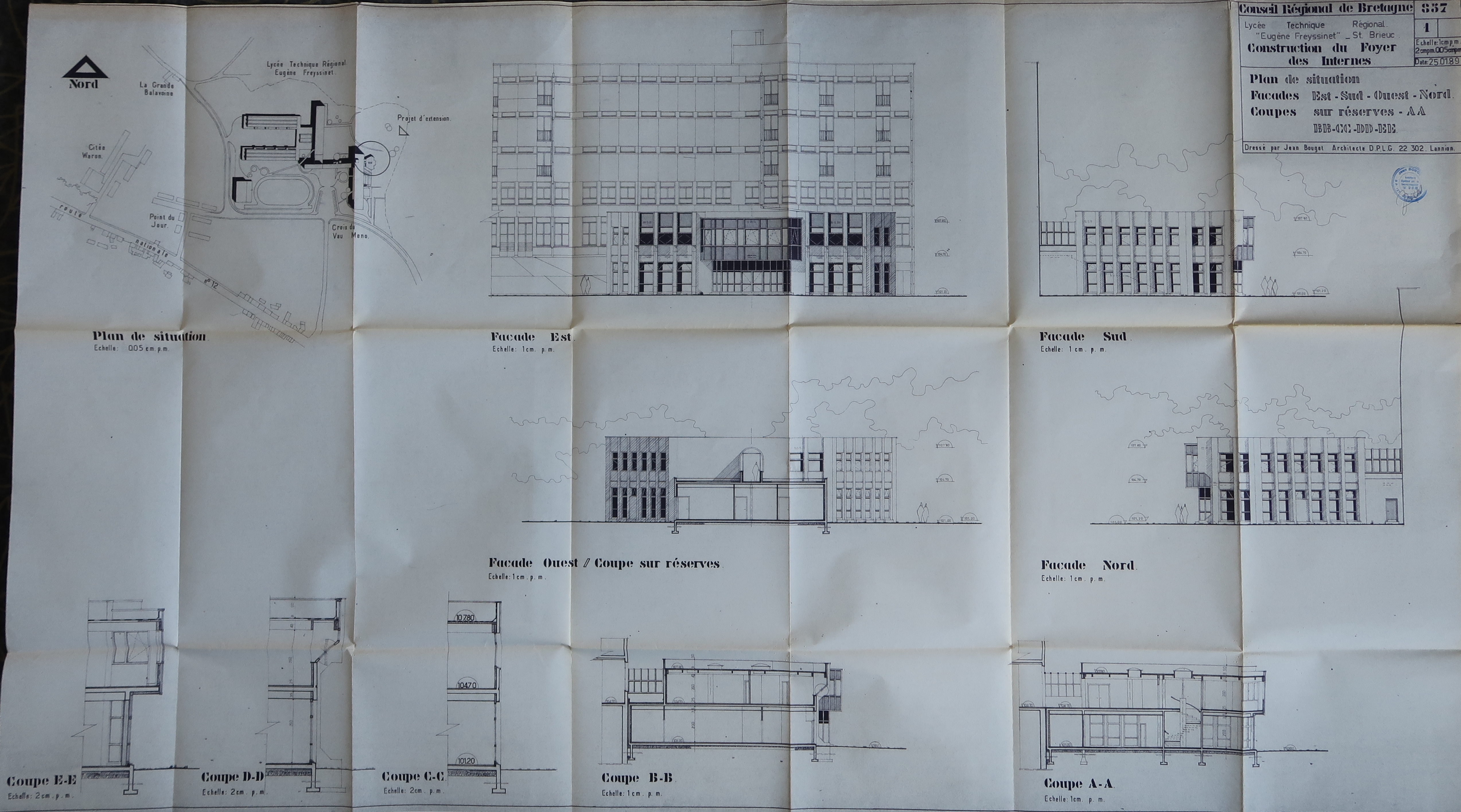Construction du foyer des internes. Plan de situation - Façades - Coupes. Jean Bouget, architecte, 1989.Immatriculation