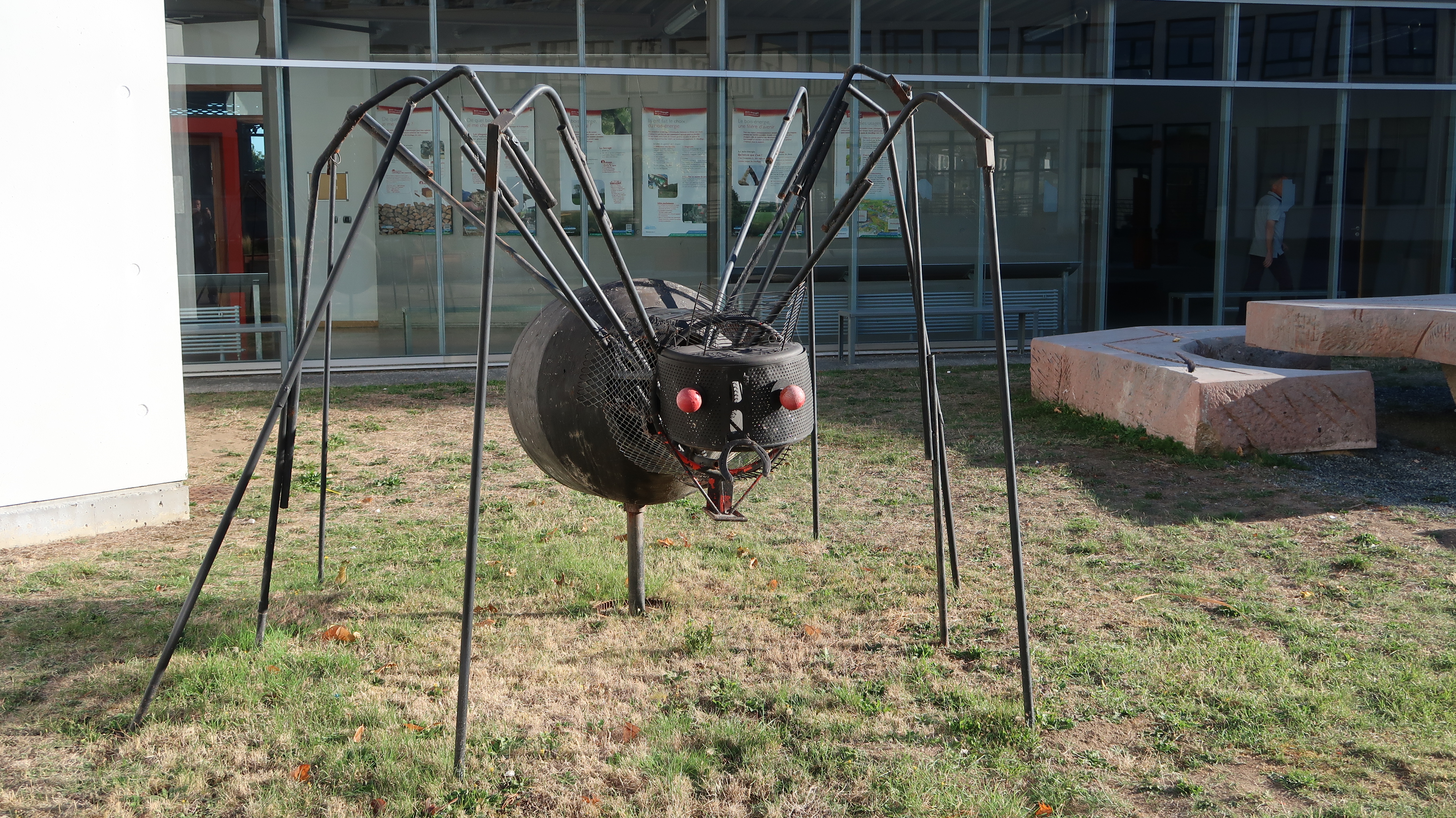 Sculpture d'élèves en métal, figurant une fourmi. Le lycée des métiers du bâtiment et des travaux publics associe les élèves à sa décoration et à la création de mobilier.Immatriculation