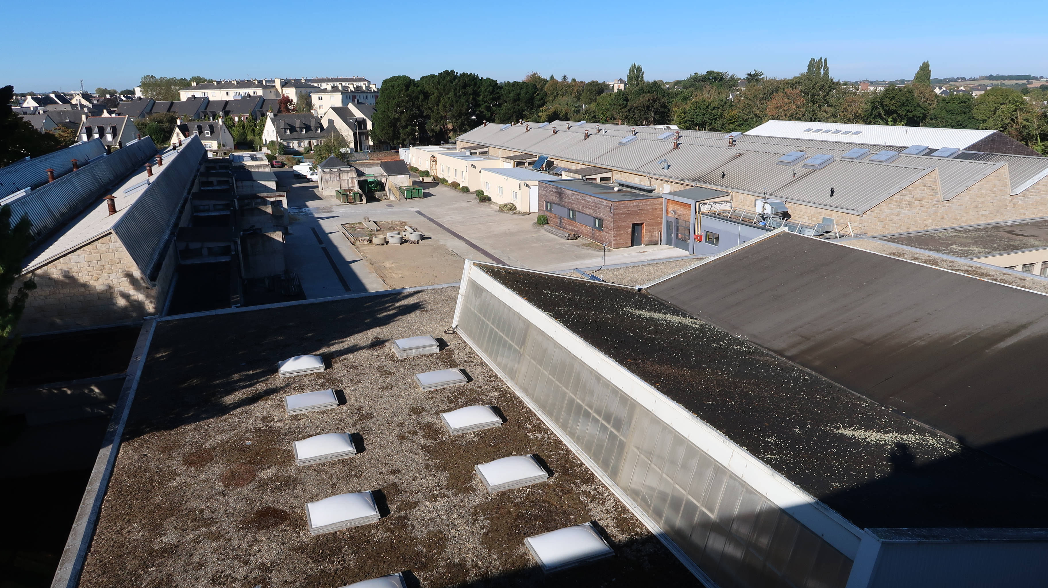 Vue d'ensemble des ateliers (bâtiments D, E et F), prise de l'est-sud-est.Immatriculation