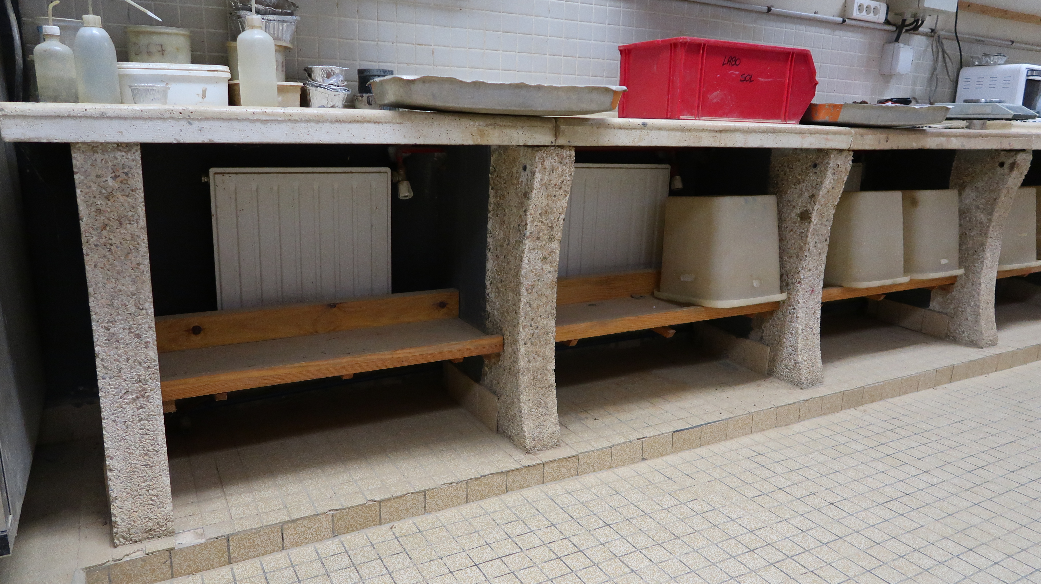 Atelier maçonnerie : vue intérieure, mobilier spécifique d'origine.Immatriculation