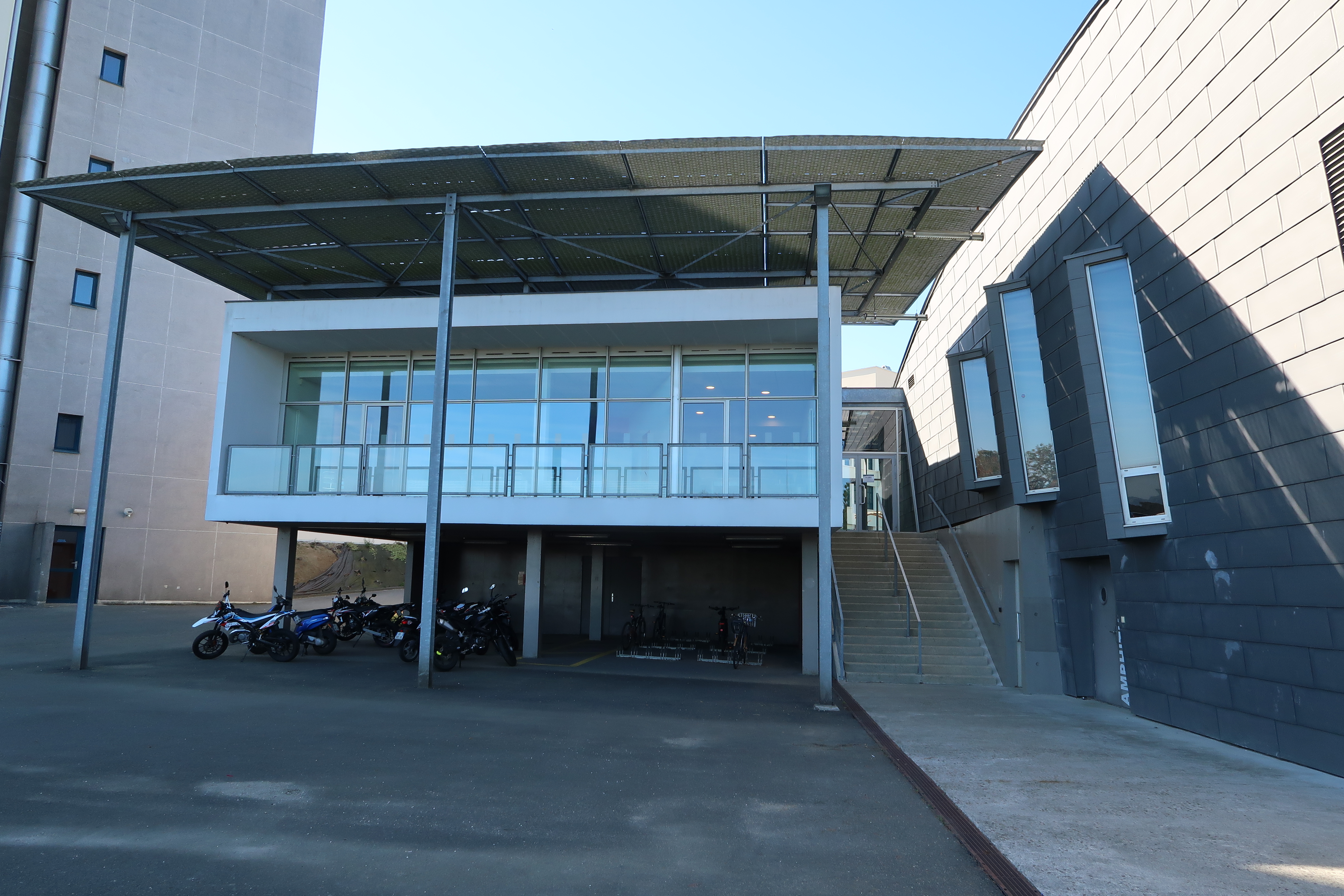 Bâtiment J, CDI, amphithéâtre, salle des professeurs, façade nord-ouest (détail). Thierry Soquet architecte, 2006.Immatriculation