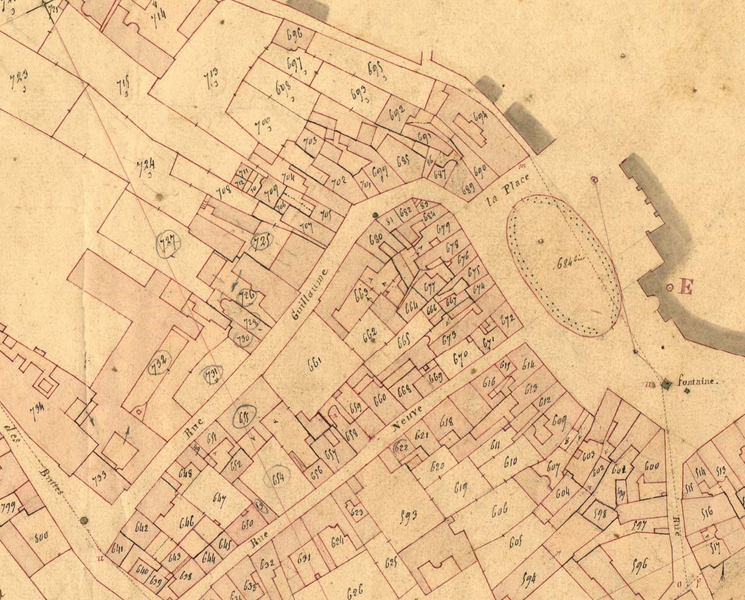 La rue Saint-Guillaume (actuelle rue de La Chalotais) en 1834. Extrait du cadastre ancien, section A2 (A.D. 22, série 3P 362/1-4)Immatriculation