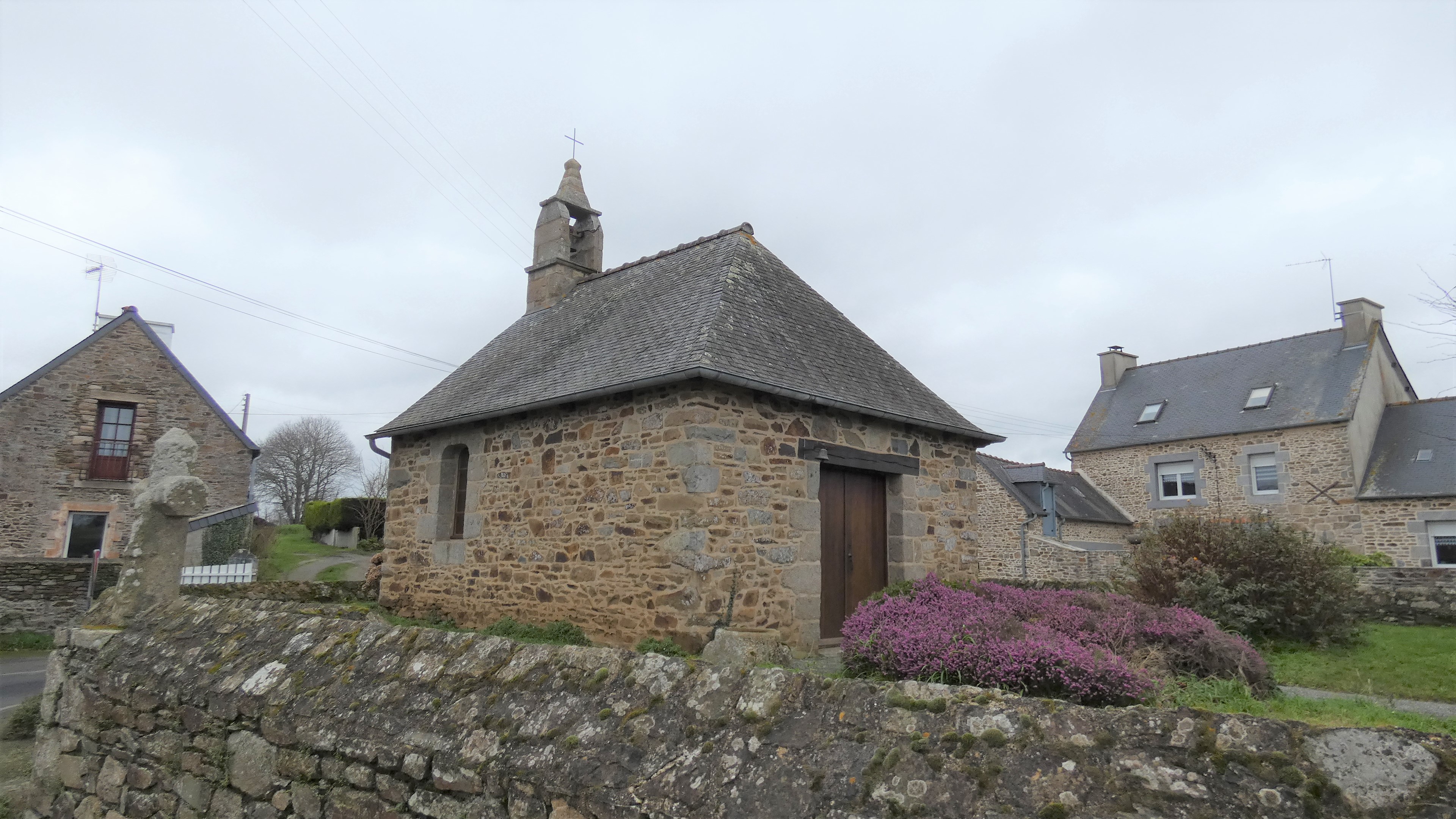Vue générale, depuis le sud-est, de la chapelle au sein de son placître et de la croix du 18e siècle. Etat en 2019.Immatriculation