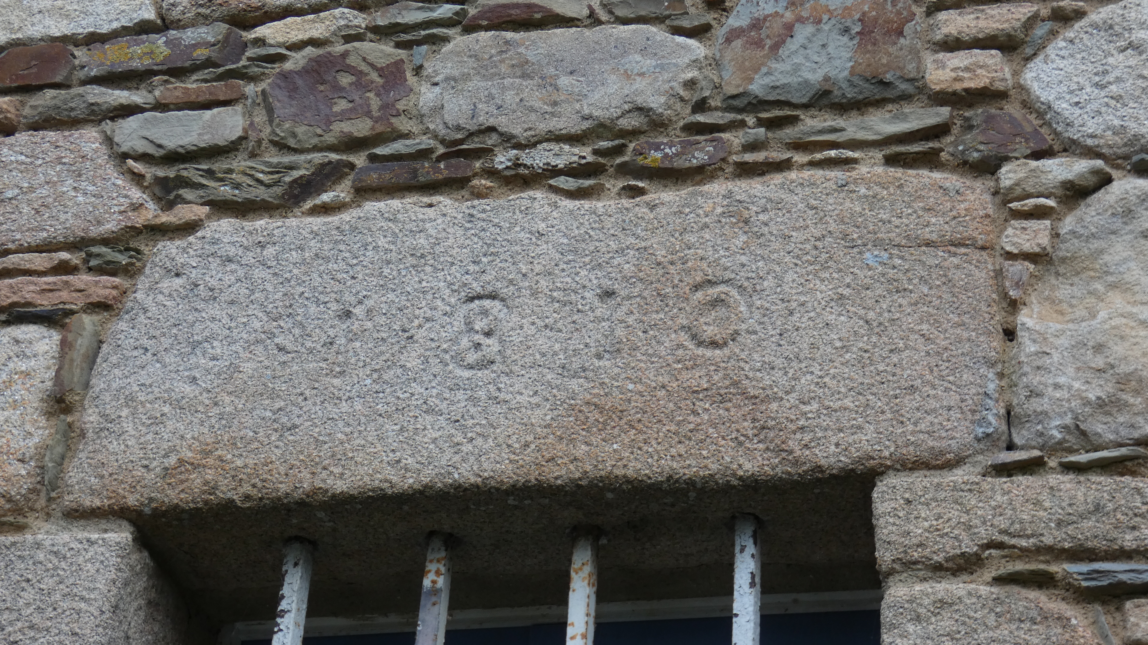 Elévation antérieure sud du logis ouest, détail de la date portée "1810" sur l'une des fenêtres du rez-de-chaussée. Etat en 2019.Immatriculation