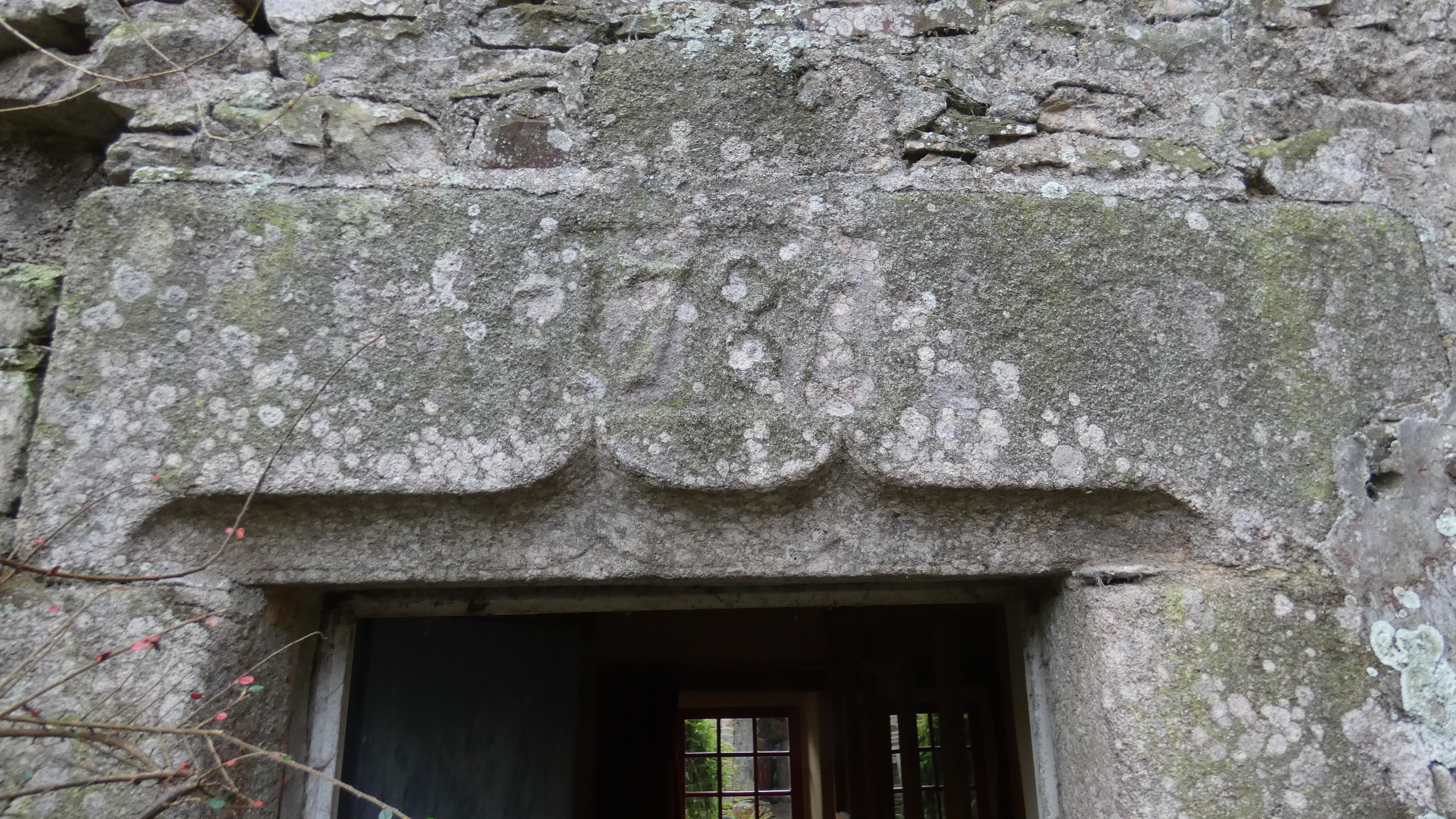 Elévation antérieure nord du logis ouest, détail de la date portée "1786" sur le linteau chanfreiné délardé en double accolade de la porte. Etat en 2019.Immatriculation