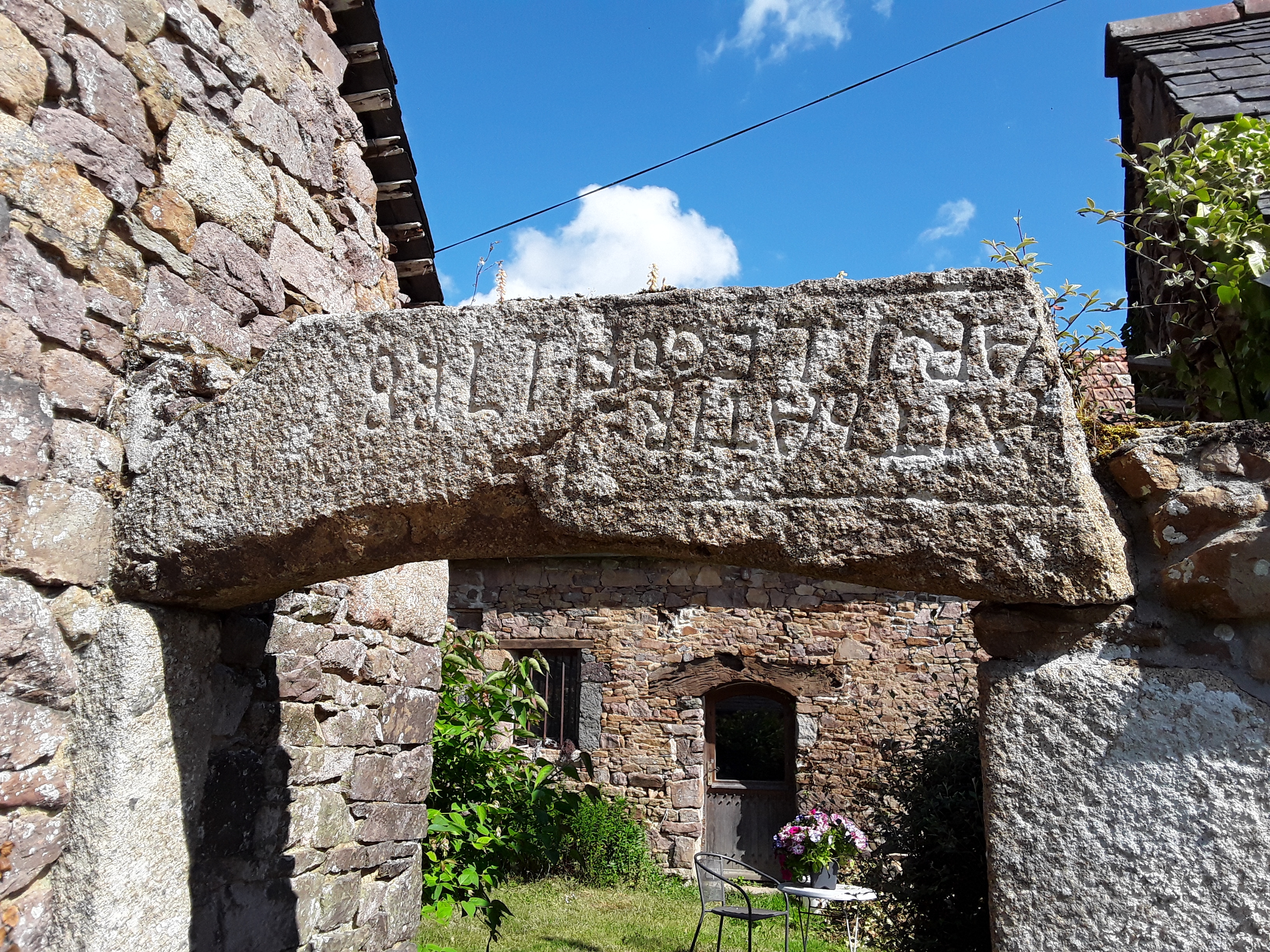 Portail d'entrée, détail du linteau portant l'inscription : "(F)AIT BATIR…. (P)AR J ( ?ou D) : LEGOF 1748 (ou 1728 ou 68 ?)". Etat en 2019.Immatriculation