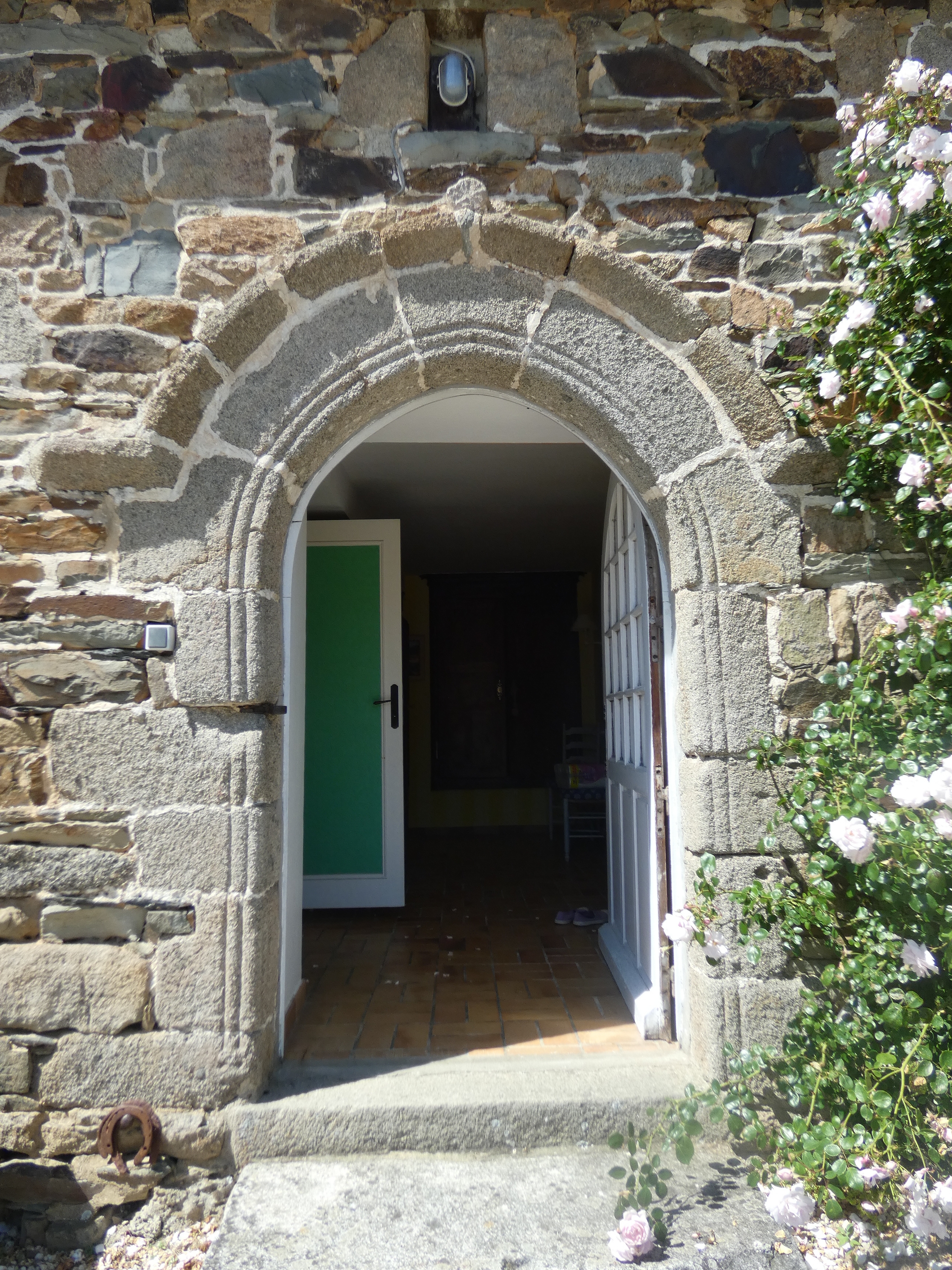 Ancien manoir de Kergrist. Façade sud-ouest du logis, porte à arc brisé issue du 15e ou du 16e siècles et surmontée d'une archivolte. Etat en 2019.Immatriculation
