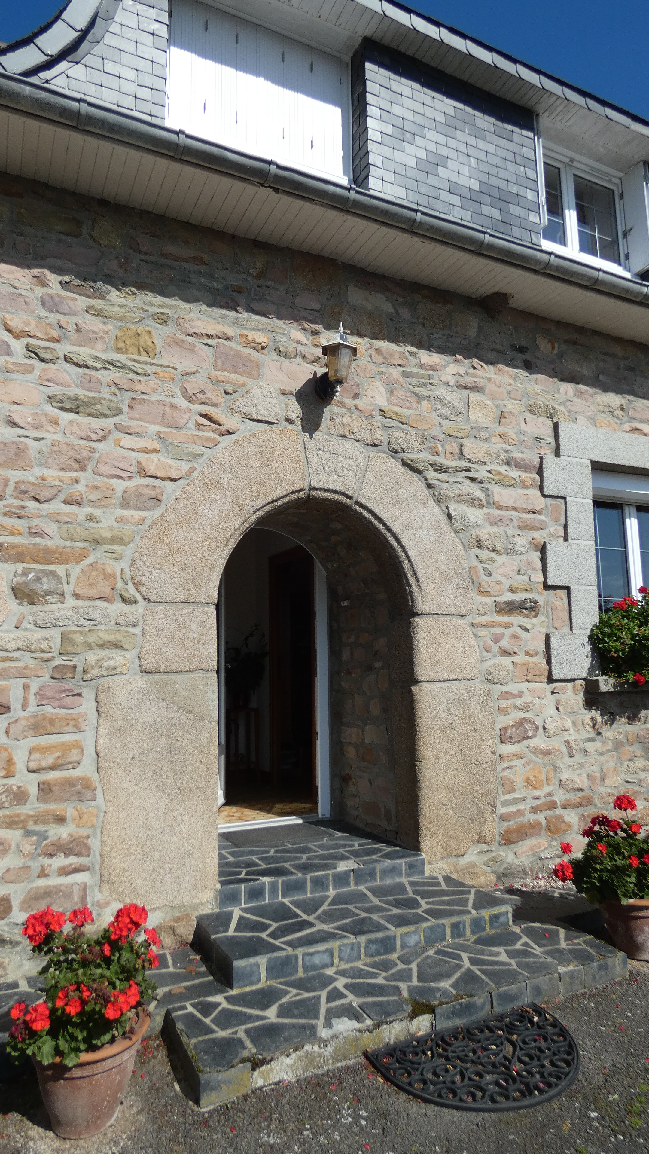 Ferme au 9 Kersauz. Détail de la porte d'entrée à arc plein cintre datée 1604. Etat en 2019.Immatriculation