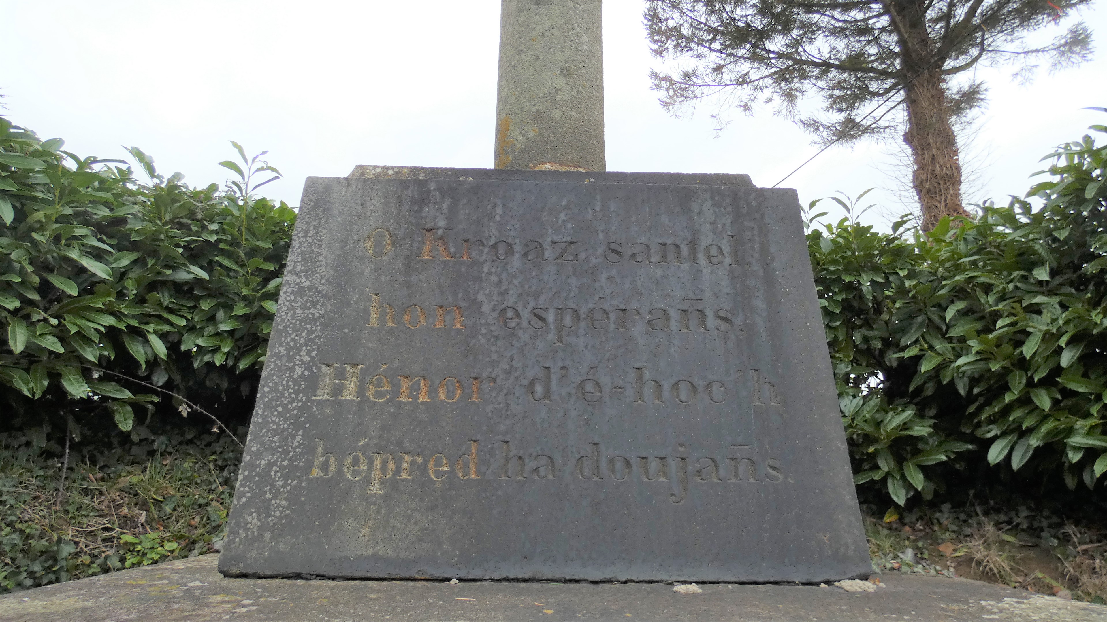 Croix de Kerescant. Vue générale de la face sud du socle. Etat en 2019.Immatriculation